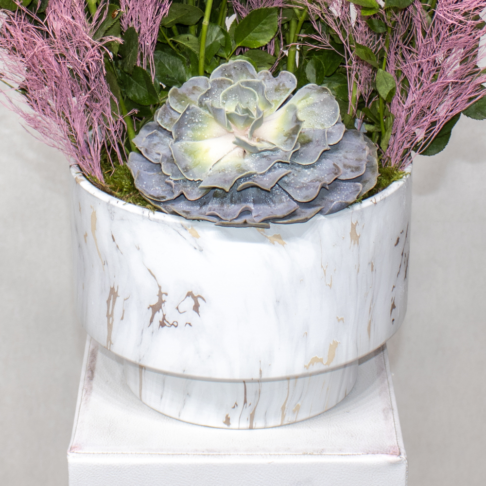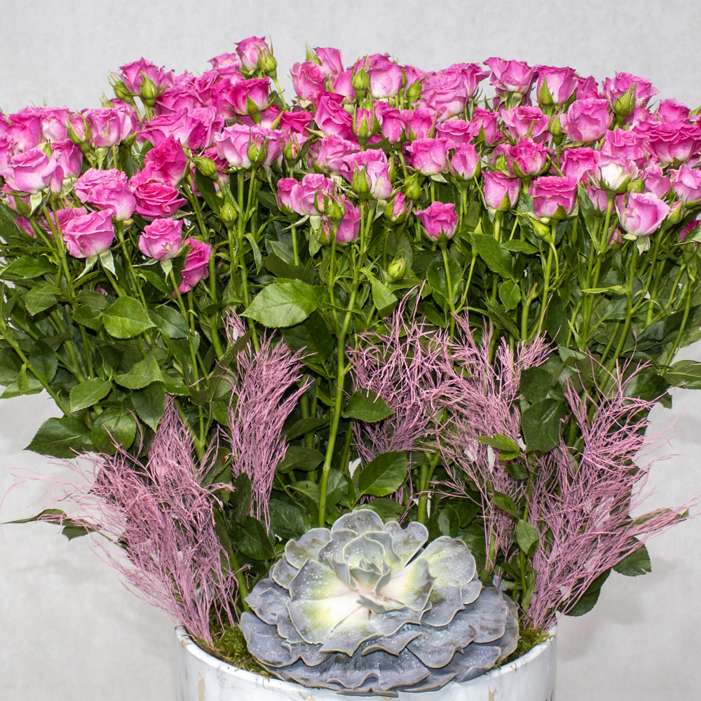 A bouquet containing fuchsia baby roses and echeveria, arranged beautifully in a vase.