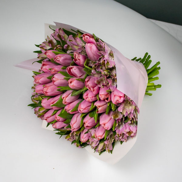This bouquet contains pink tulip beautifully wrapped with ribbon.