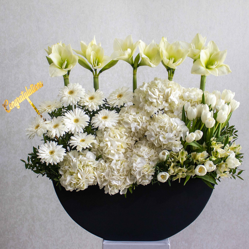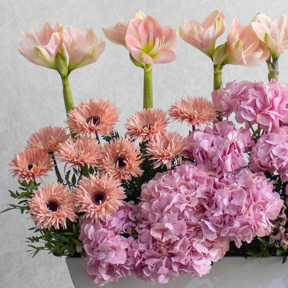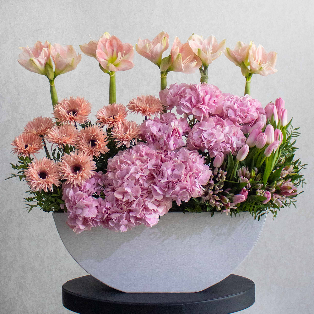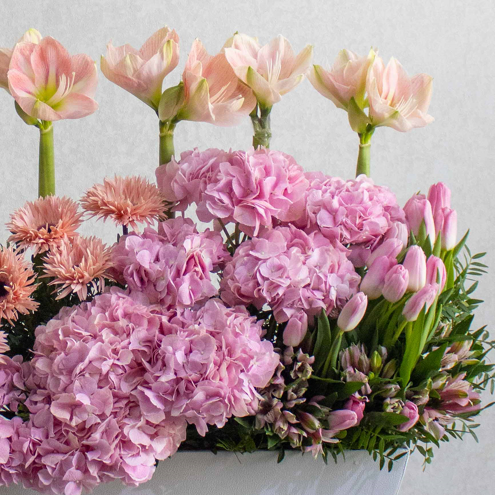A vase filled with tulips, hydrangeas, gerberas, alstroemerias and amaryllis.