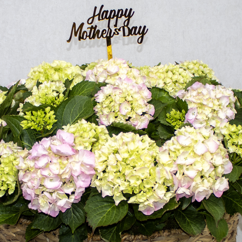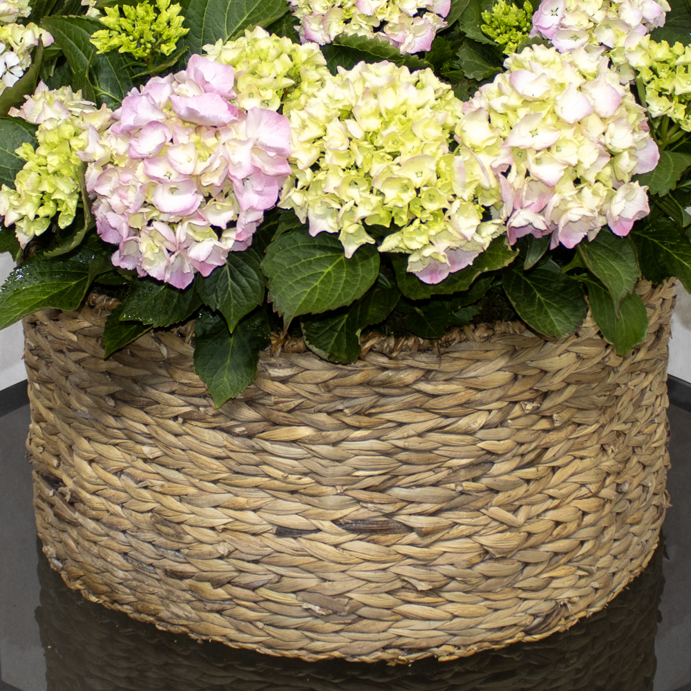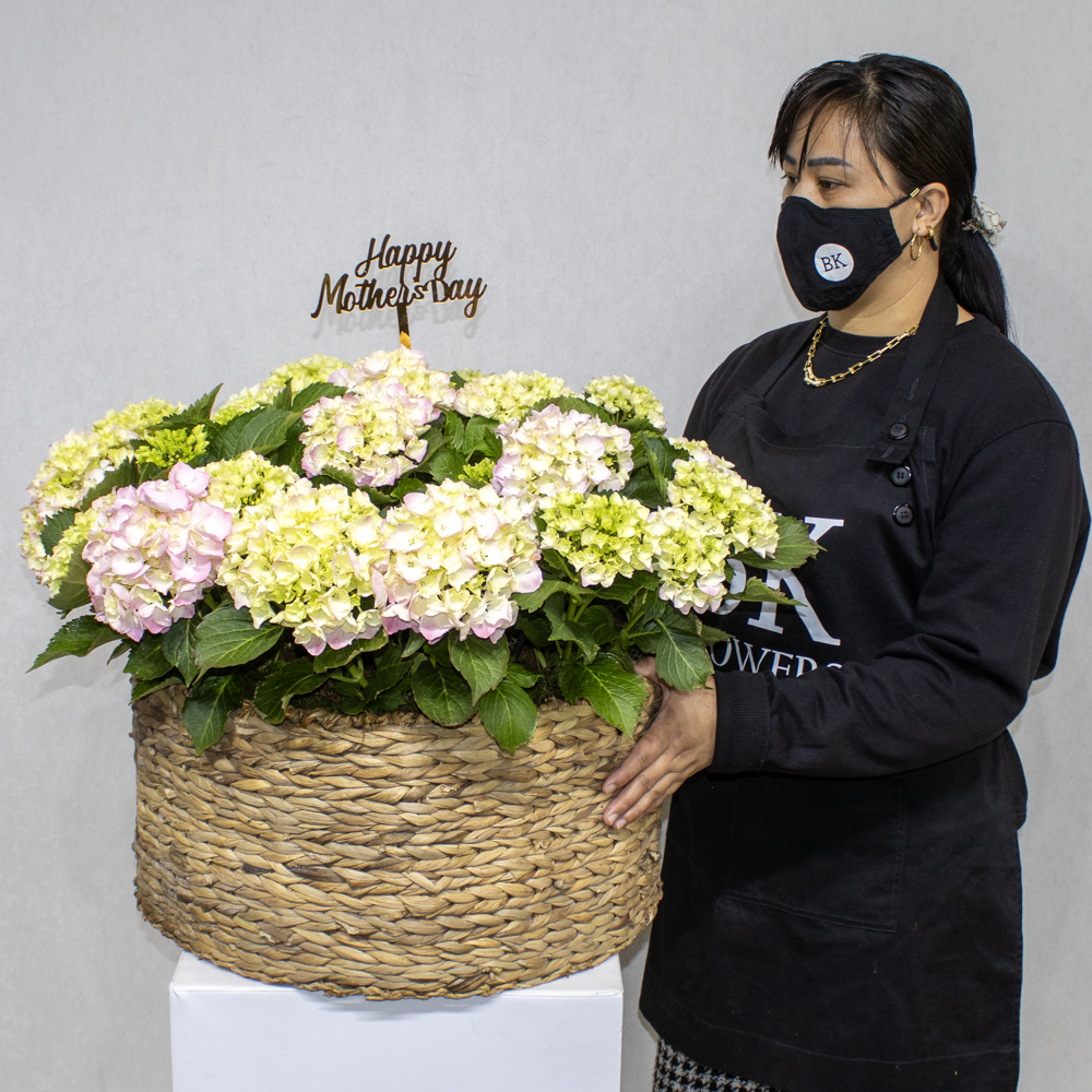 A handmade vase containing light pink hydrangeas, arranged beautifully.