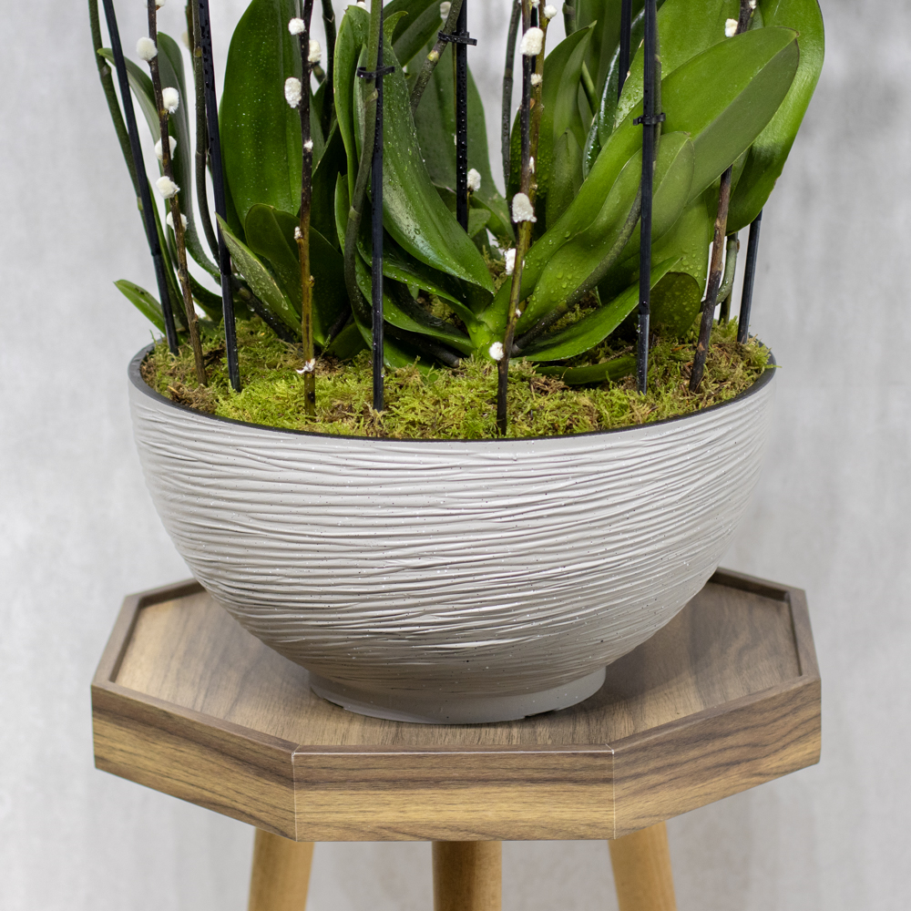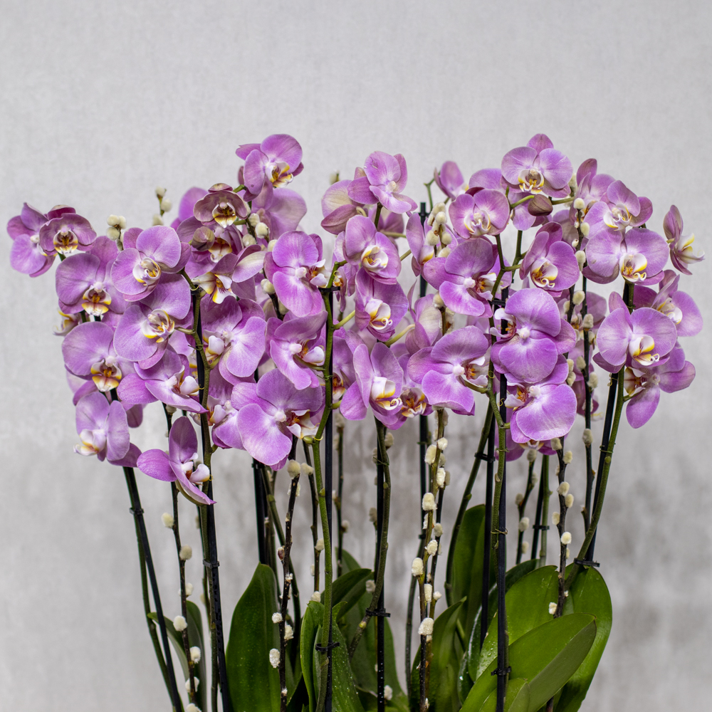 This bouquet contains pink orchid plants, beautifully arranged in a luxurious vase.