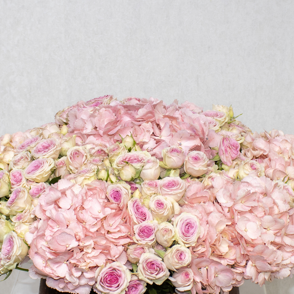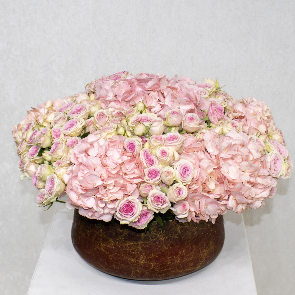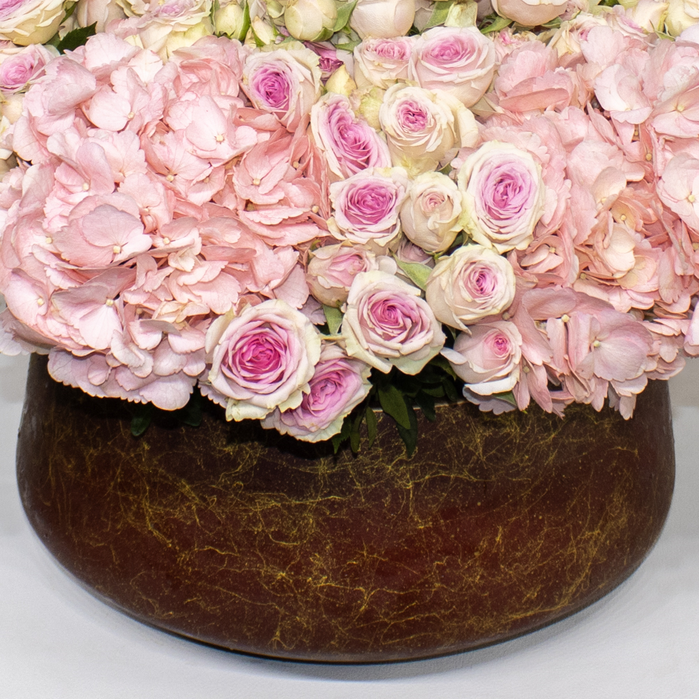 An elegant ceramic vase featuring hydrangeas and baby roses in pink shades.