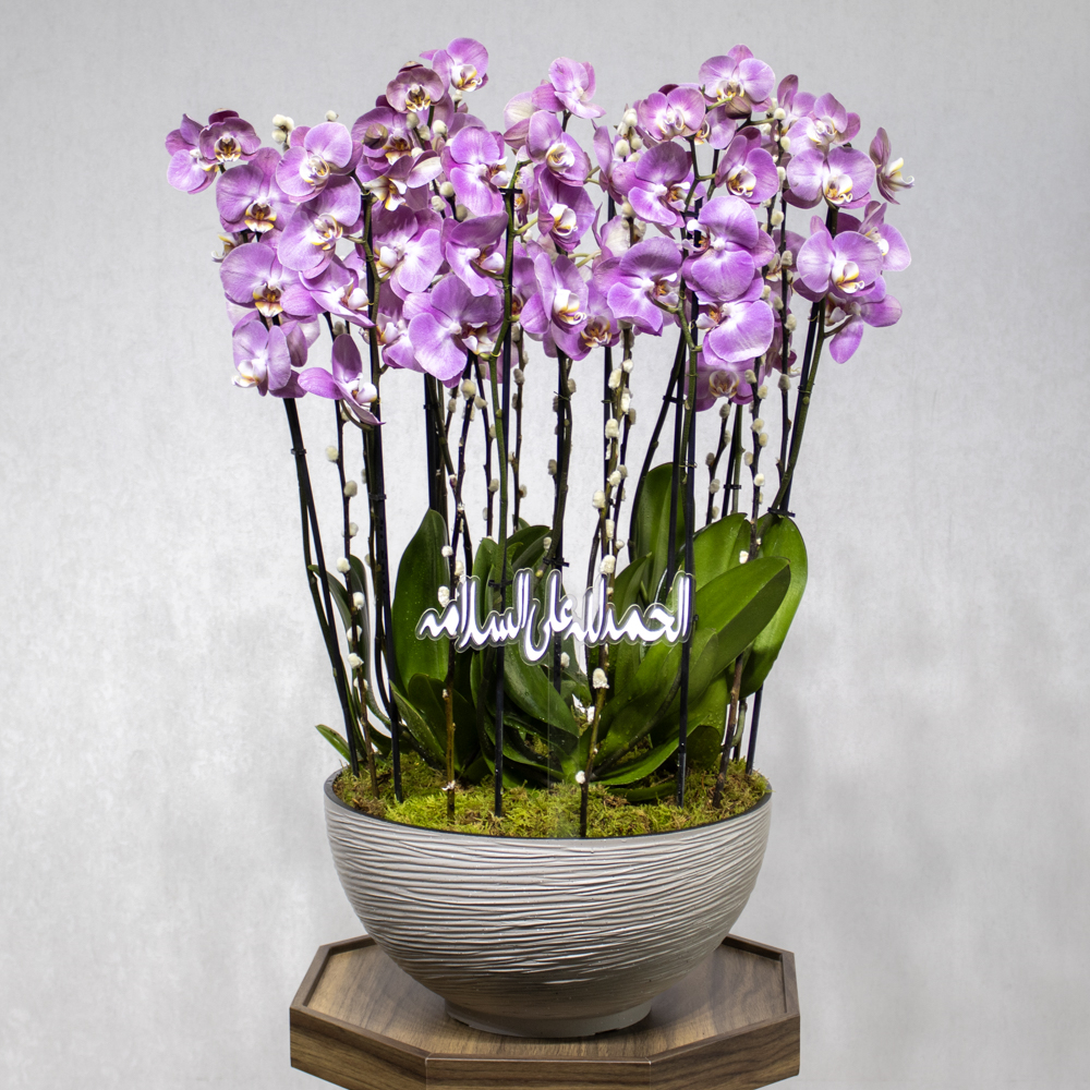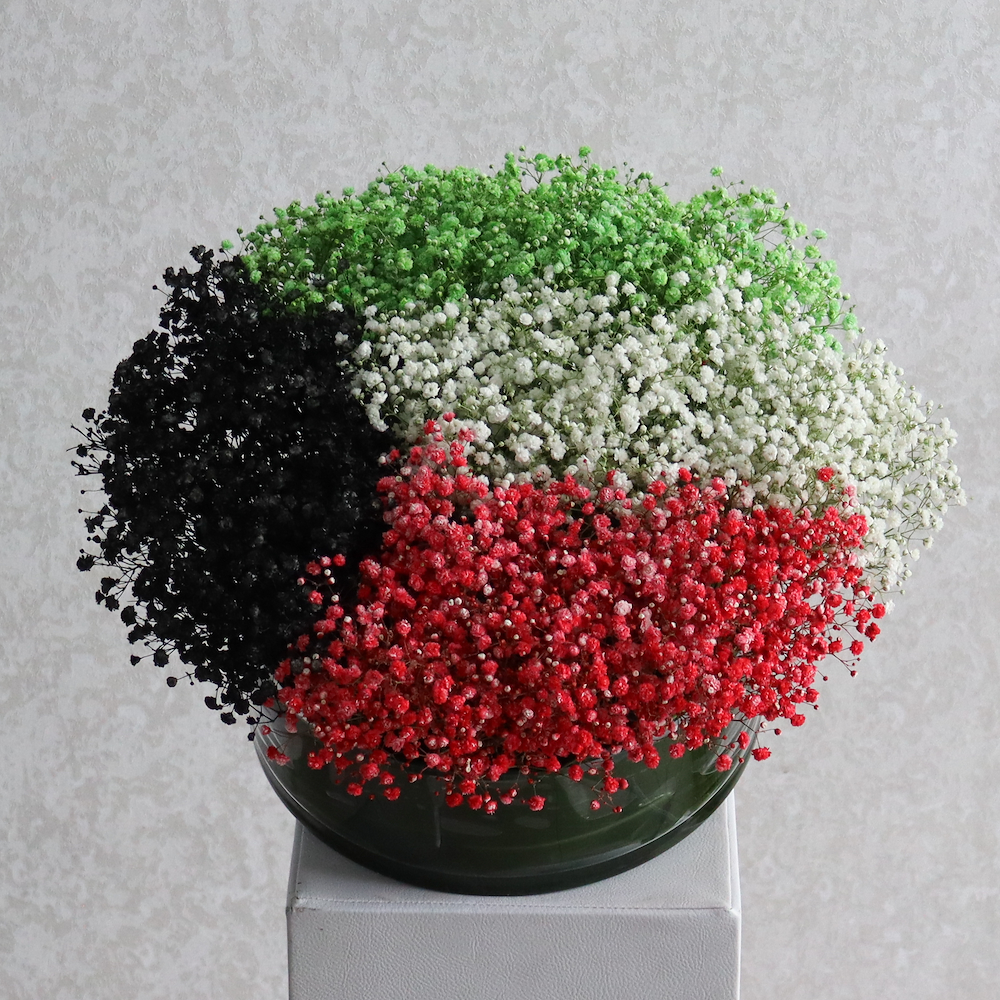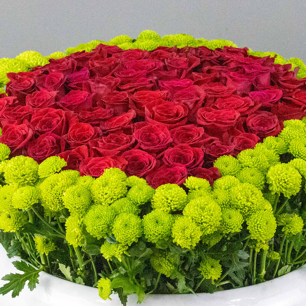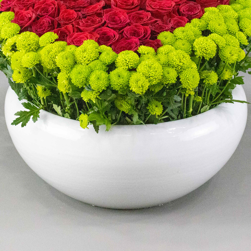 A ceramic vase containing red roses and green santini, arranged beautifully.