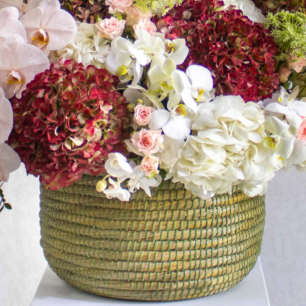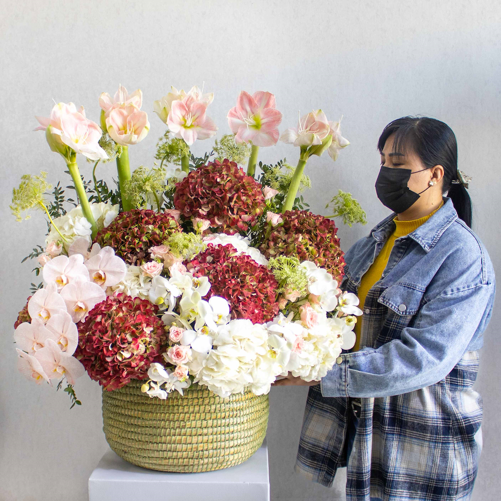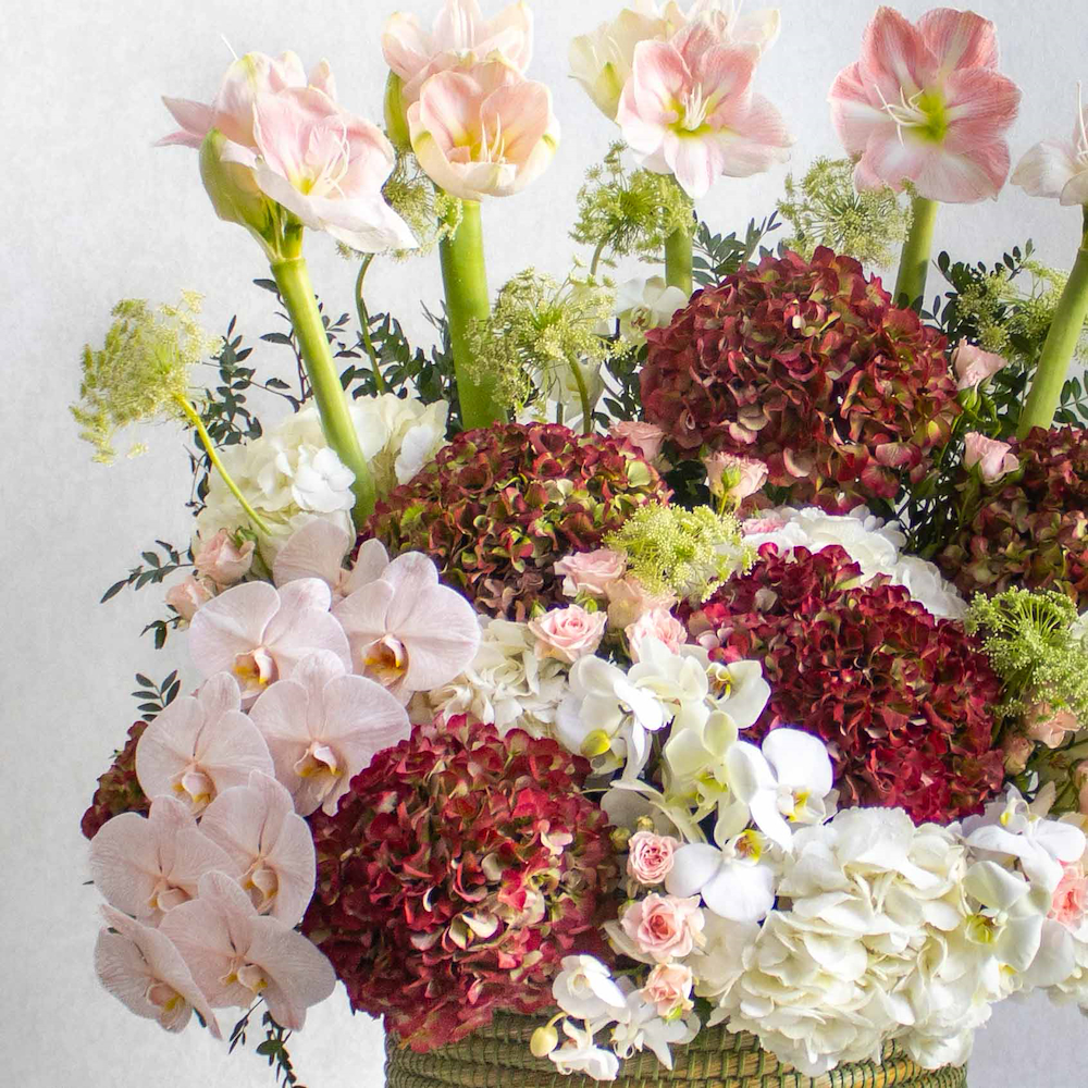 This bouquet contains hydrangeas, amaryllis, cut orchids, and baby roses, beautifully arranged in a handmade vase.