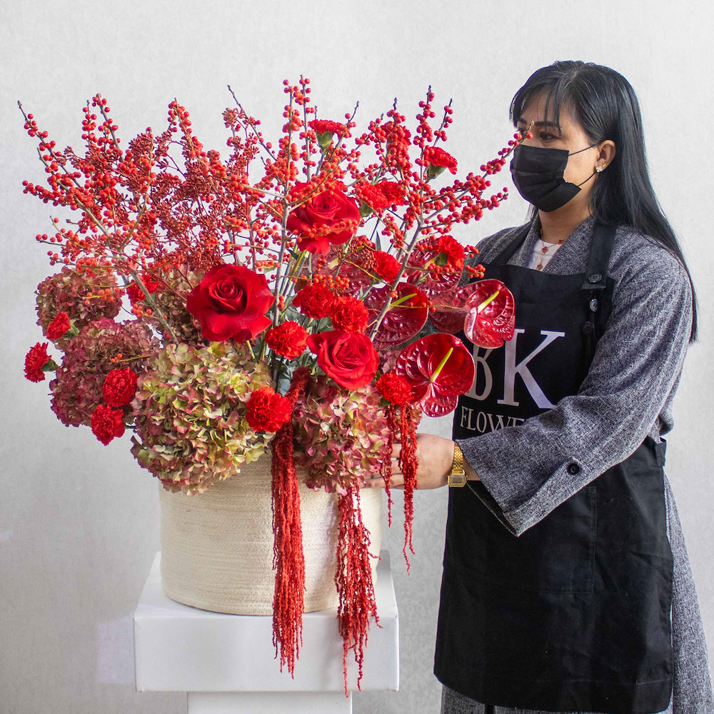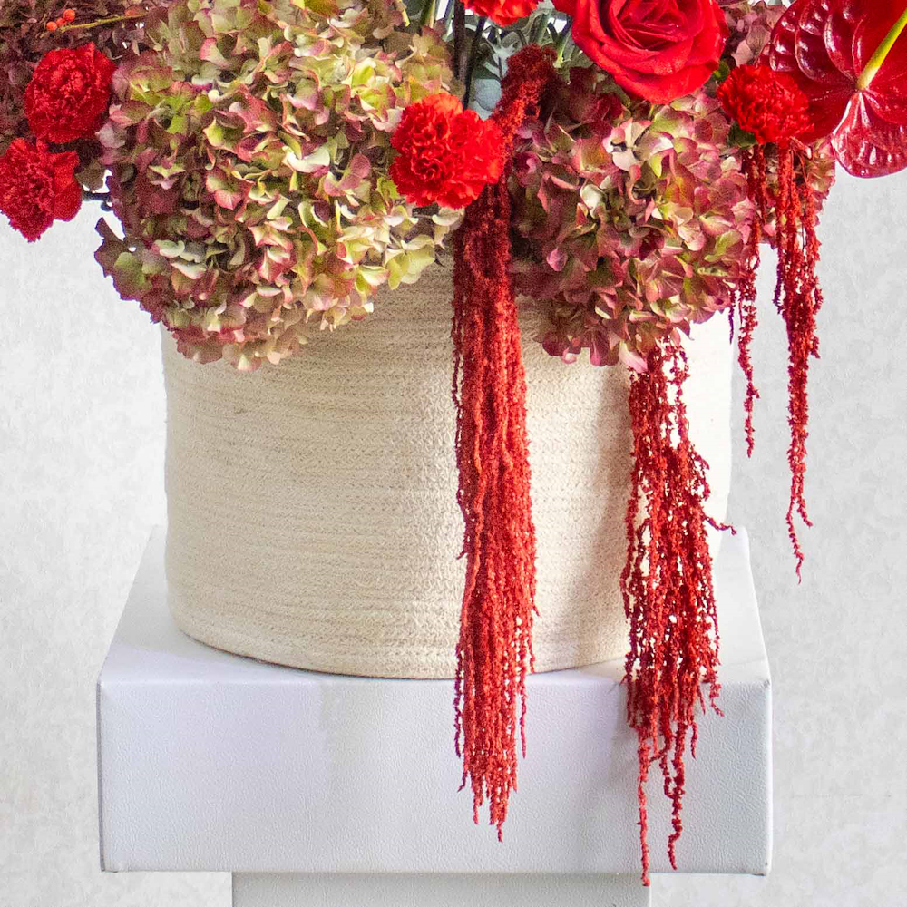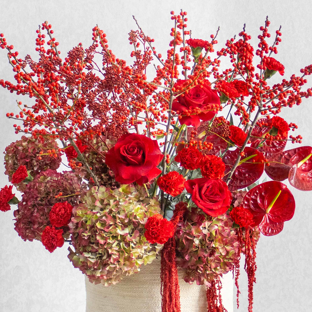 This bouquet contains hydrangeas, carnations, and waxy, heart shaped red anthuriums, roses are beautifully arranged in a handmade vase.