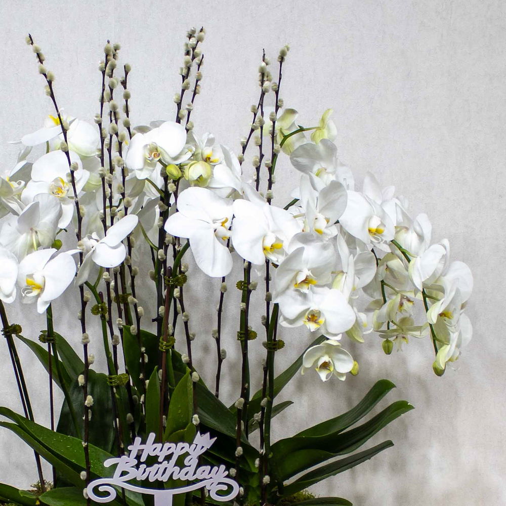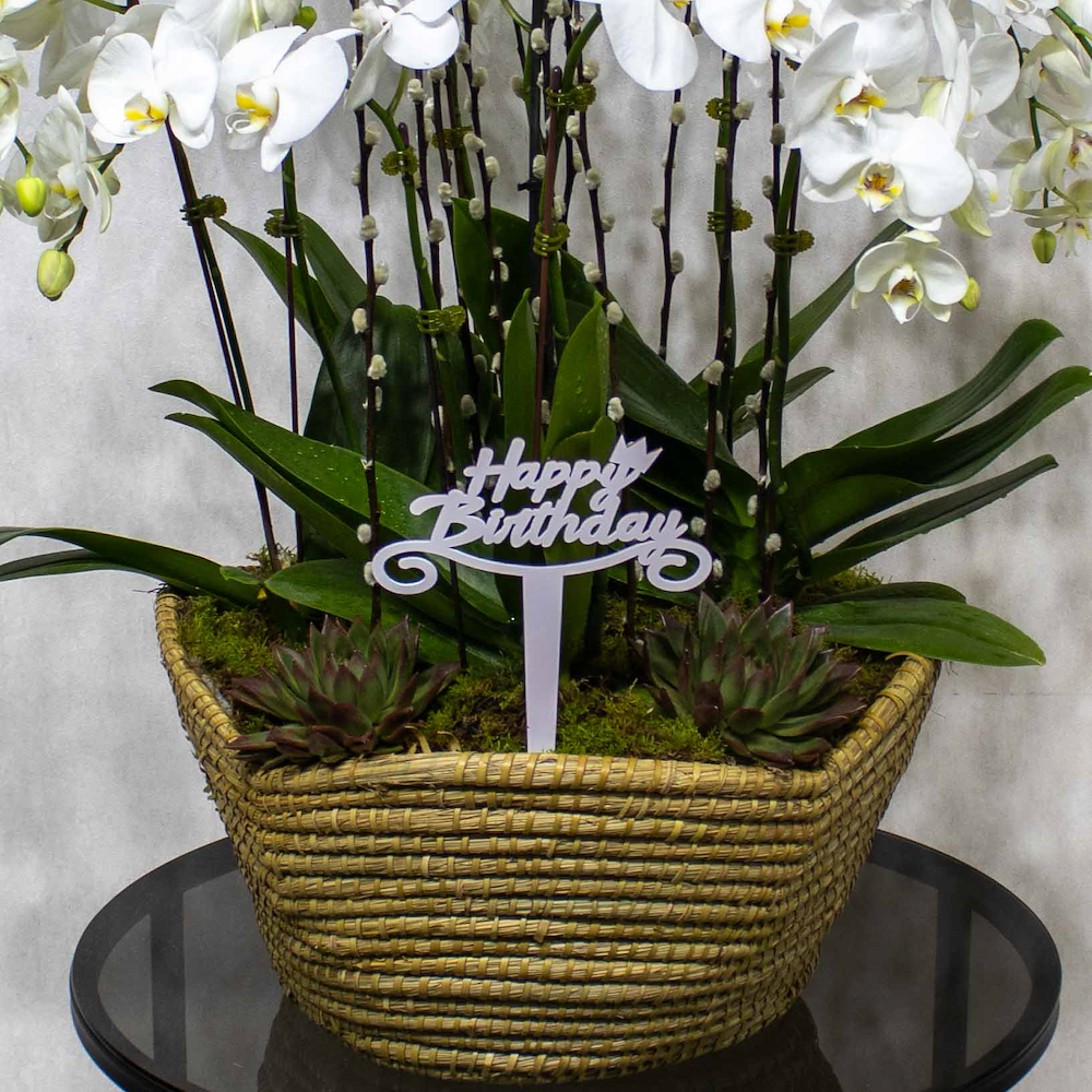 This bouquet contains special white orchids and echeveria beautifully arranged in a beautiful hand made basket.
