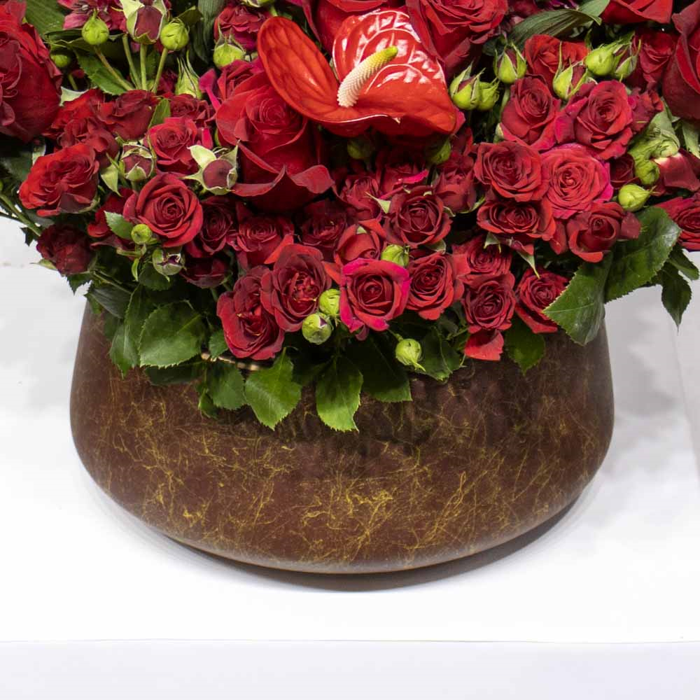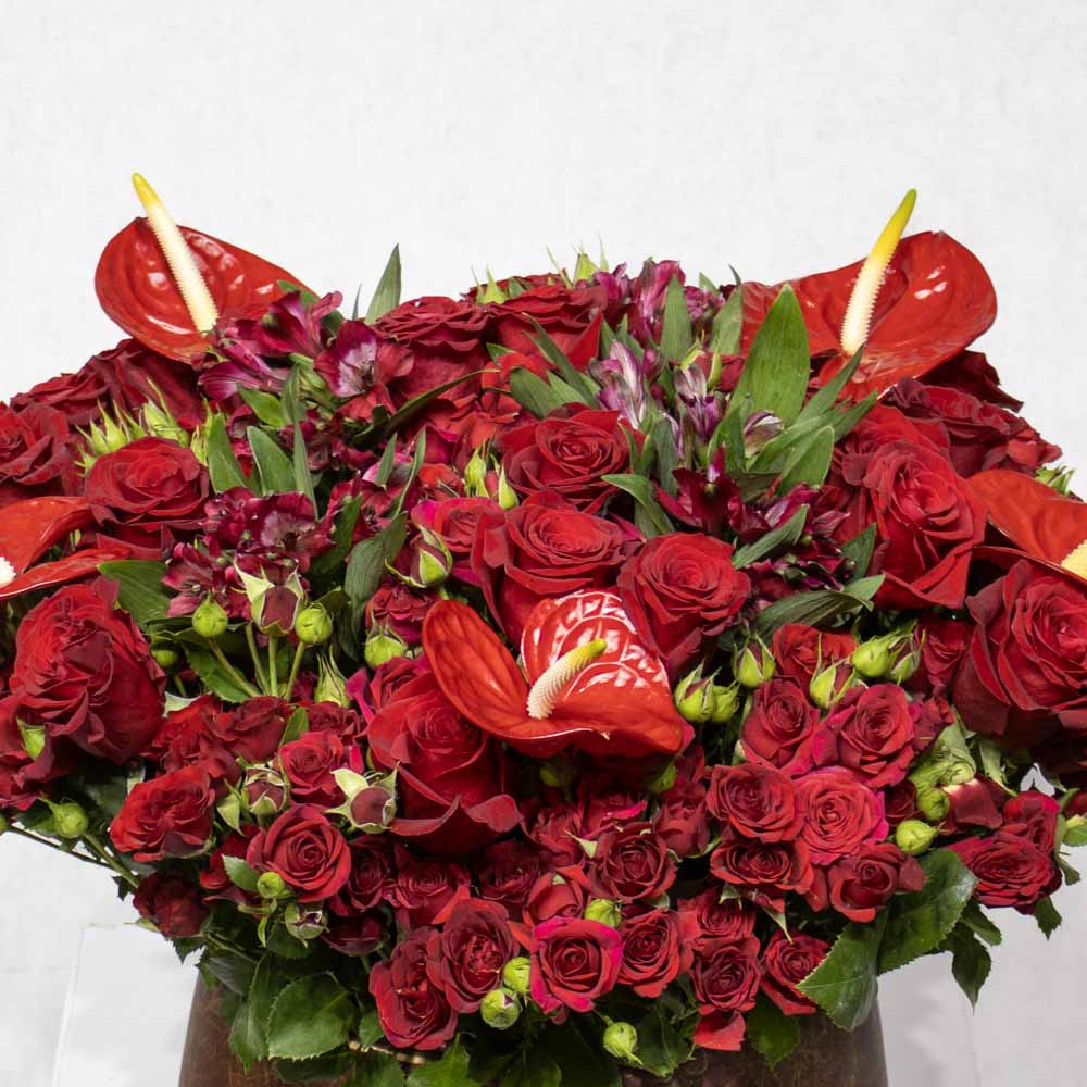 A bouquet containing red roses, anthuriums, and alstroemerias, arranged beautifully in a red vase.