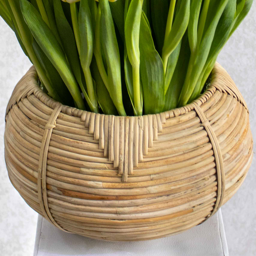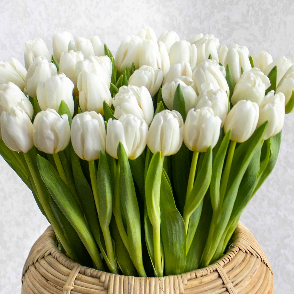 This luxury handmade basket contains white tulips, arranged beautifully.