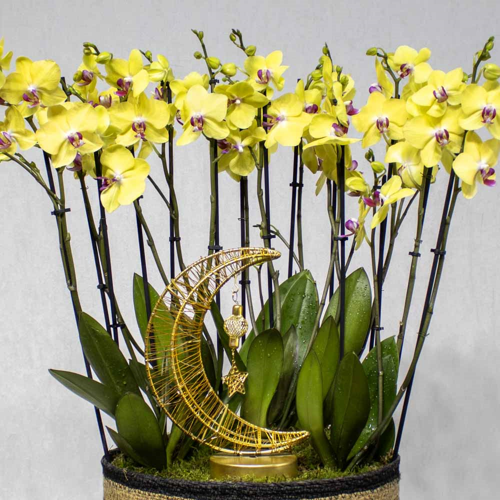 This arrangement contains beautiful yellow orchid plants in a handmade vase.