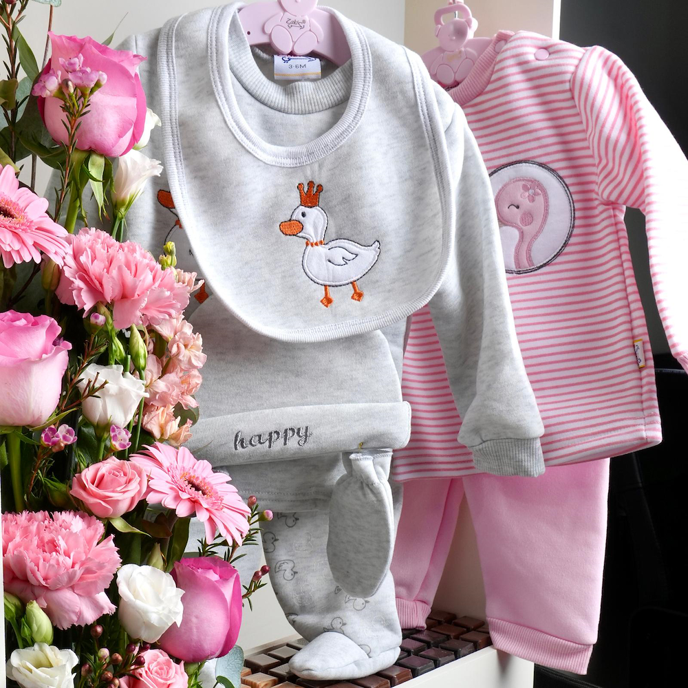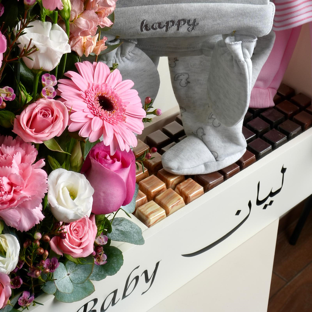A wooden box containing roses, matthiola, carnations, and gerberas, along with a Baby pajama and 44 pieces of chocolate.