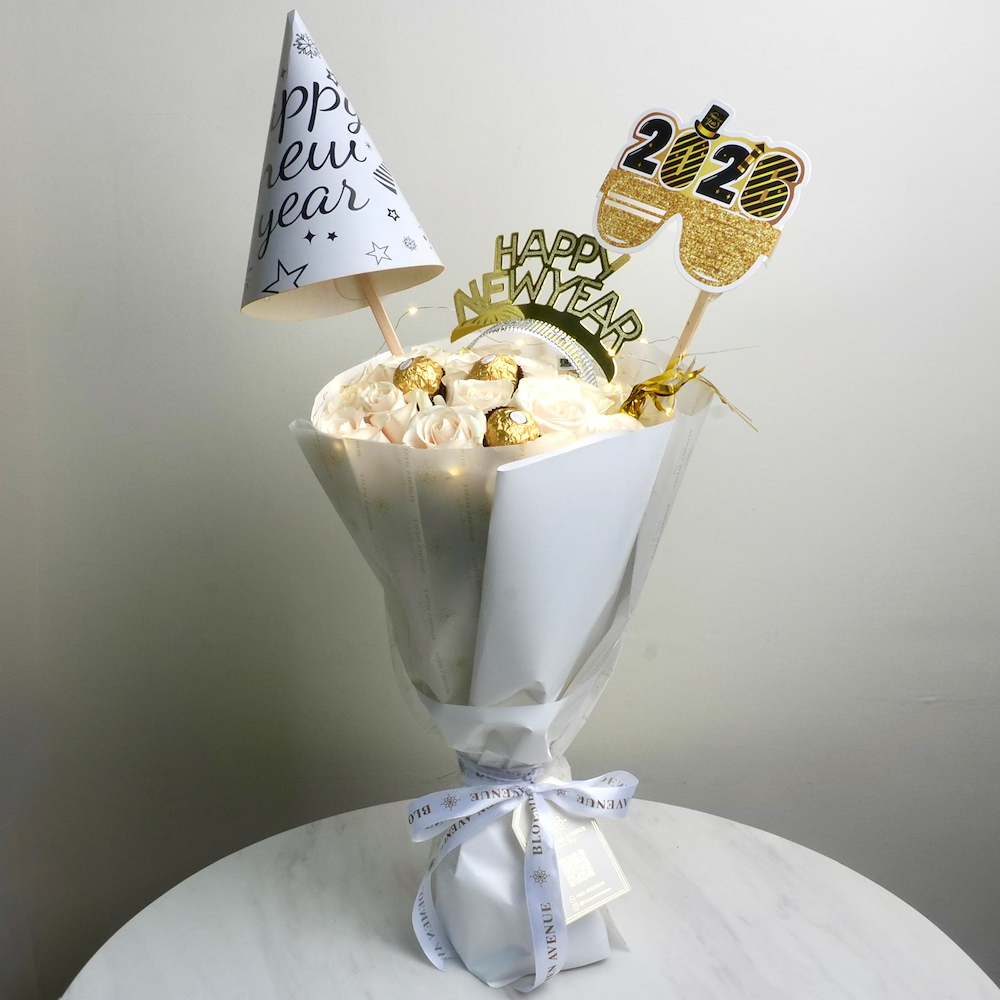 A box that contains roses, baby roses, carnations, gerberas and eucalyptus along with a Graduation topper.