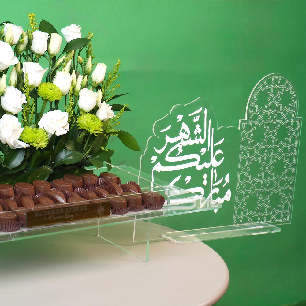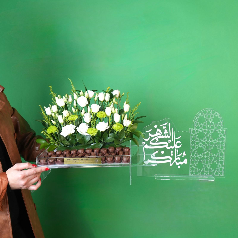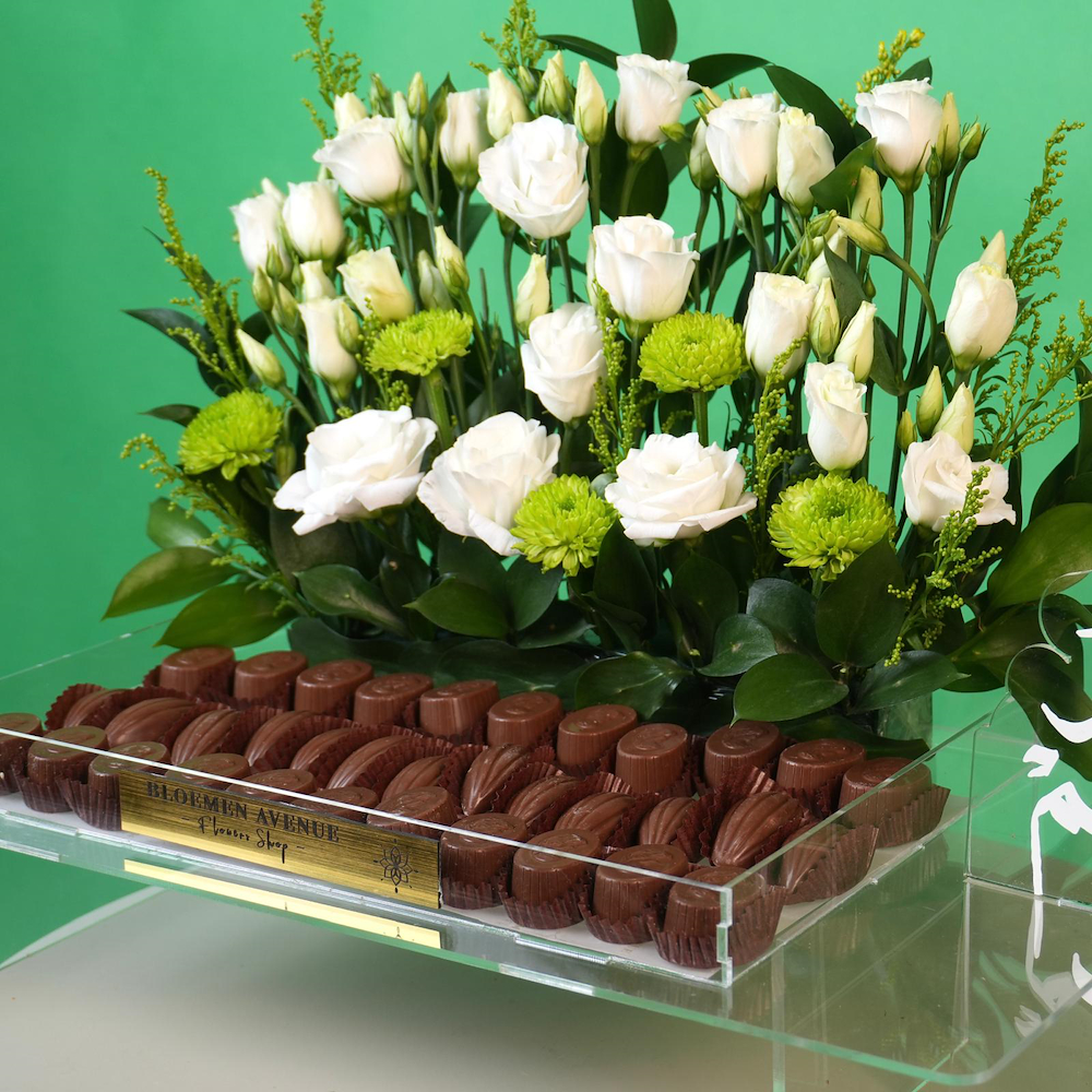 A tray containing white lisianthus and green chrysanthemums, with half a kilo of chocolate.