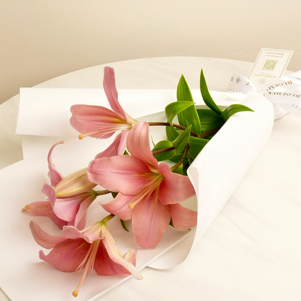 A hand bouquet containing elegant casablanca flowers, beautifully arranged in a pristine white wrapping. Perfect for any special occasion.