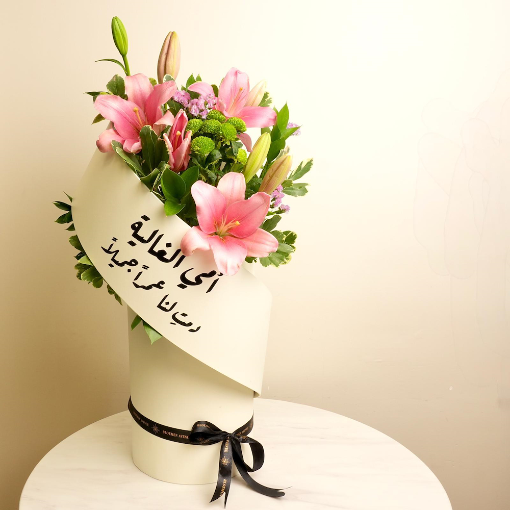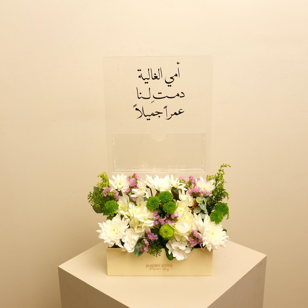 A marble tray that contains baby rose, gerbera, cymbidium, and carnation flowers with 40 pieces of chocolate.