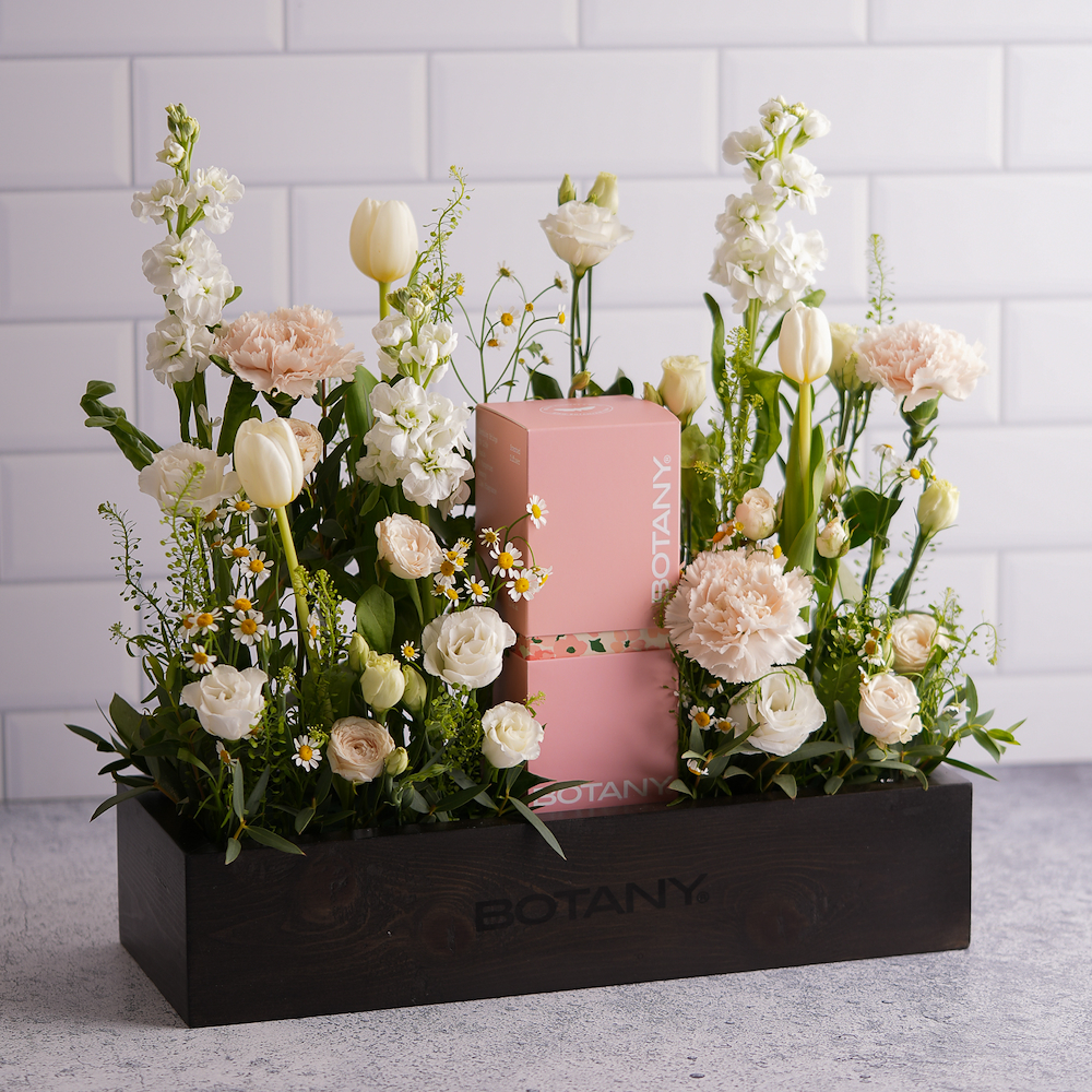 A graceful wooden box filled with tulips, roses, and carnations, with a scented diffuser.