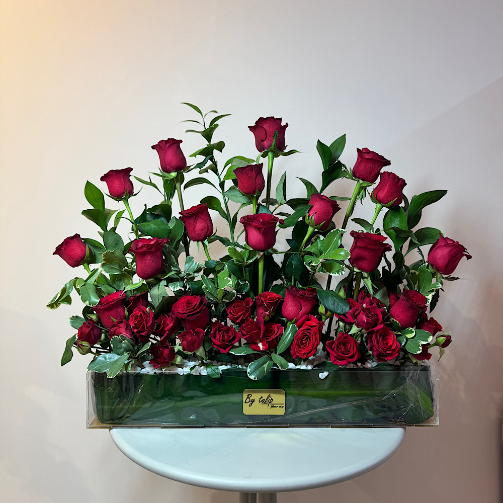 A regal arrangement in rectangular acrylic overflowing with classic red roses and baby roses. Designed with varying heights to fill the space with romance, with a "Happy Anniversary" card.