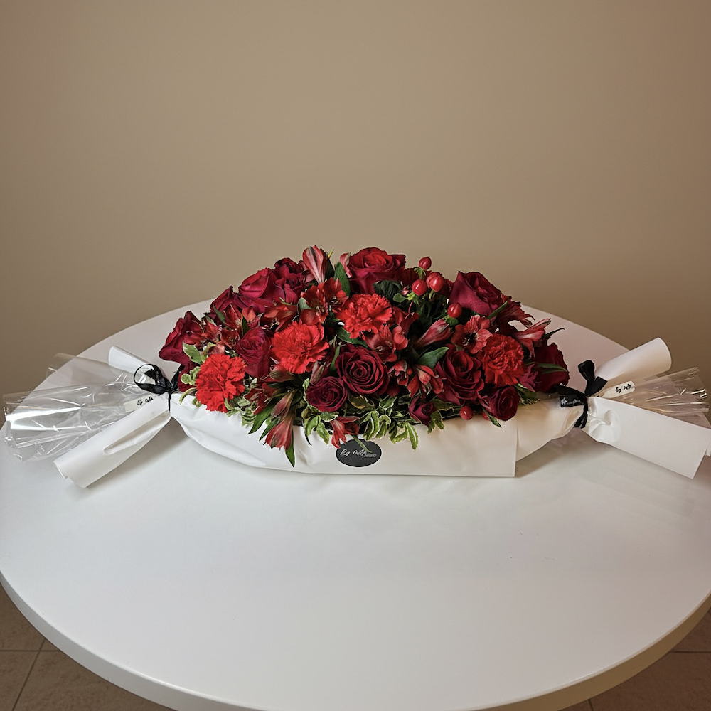 A modern and innovative design, shaped like a candy bar wrapped in luxurious white paper, combines elegance and playfulness. The arrangement features a rich blend of classic red roses, red carnations that add soft depth, and touches of tiny hypericum flowers with green alstroemeria leaves. The design is completed with a stylish black ribbon