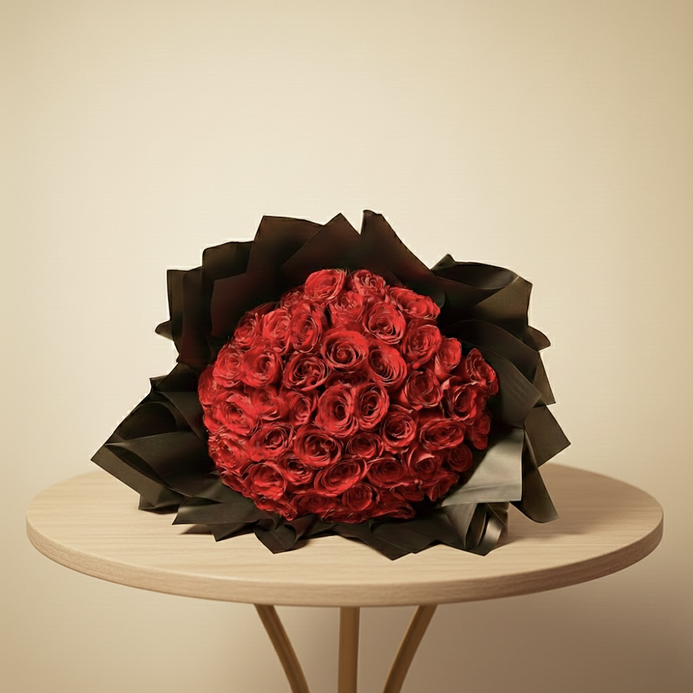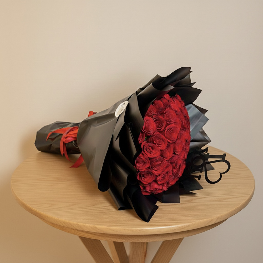 A luxurious hand-tipped bouquet of 50 red roses, wrapped in matte black paper for a dramatic and eye-catching contrast. It is finished with a red satin ribbon and a modern "I Love You" tag.
