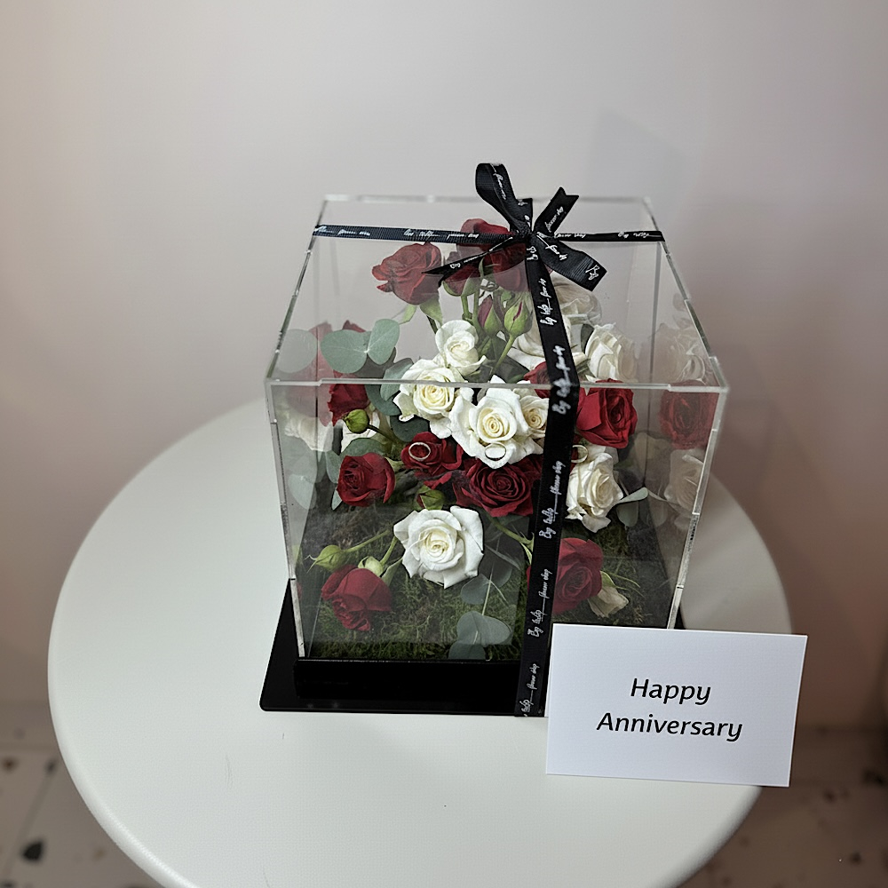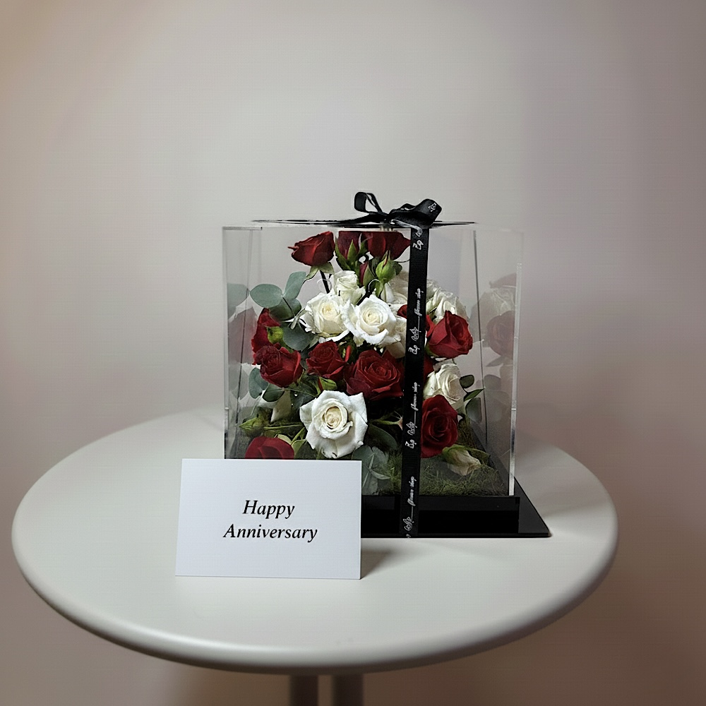 This regal arrangement inside a clear acrylic box combines deep red and pure white roses, with green eucalyptus. It features an elegant gift card.