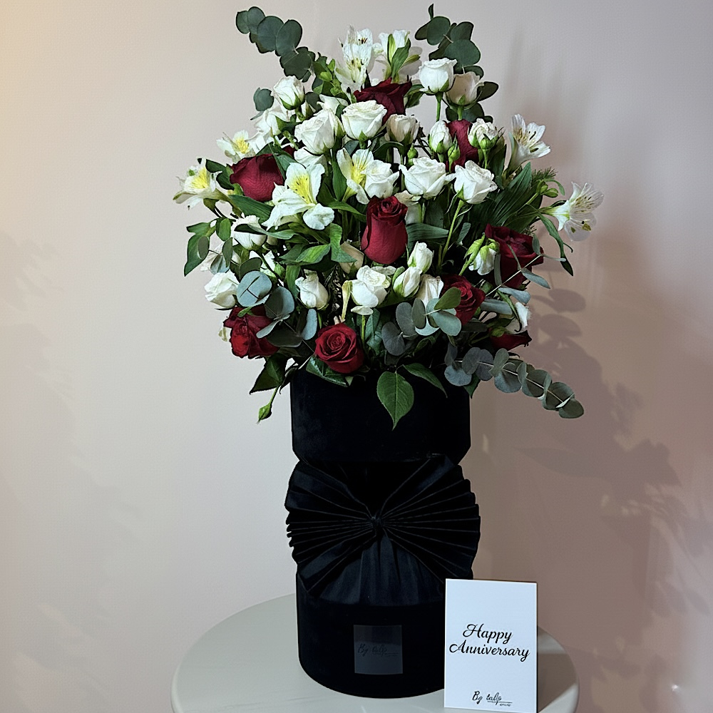 A velvet box that contains roses, baby roses, alstroemerias and eucalyptus.