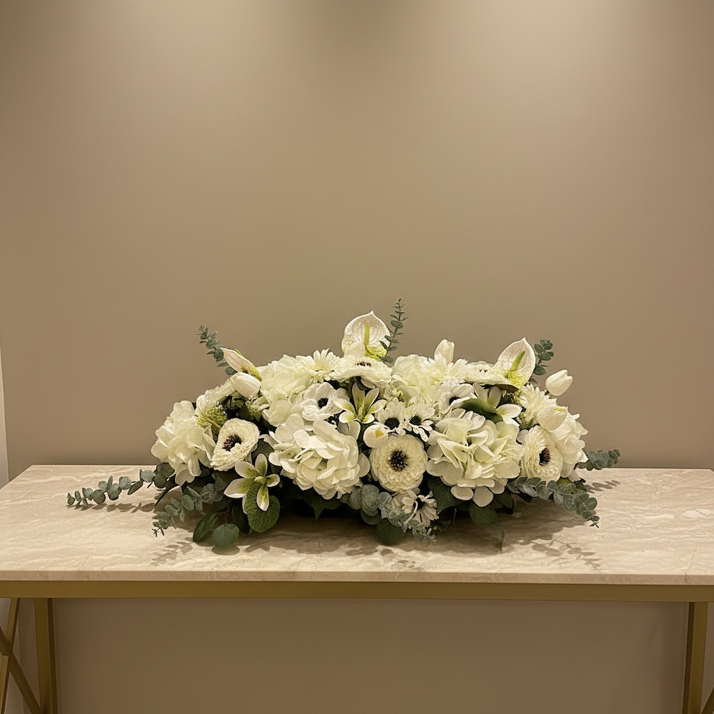 A floral centerpiece featuring hydrangea, tulips and anthurium flowers, with elegant and modern touches.