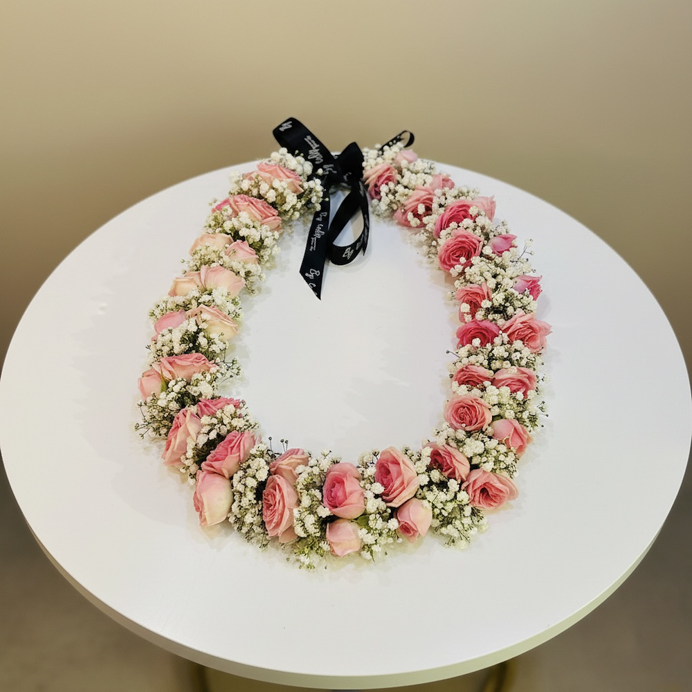 A long wreath of soft pink roses coordinated with dense white gypsophila flowers, combining simplicity and elegance, with a luxurious black satin ribbon that adds an attractive contrasting touch.