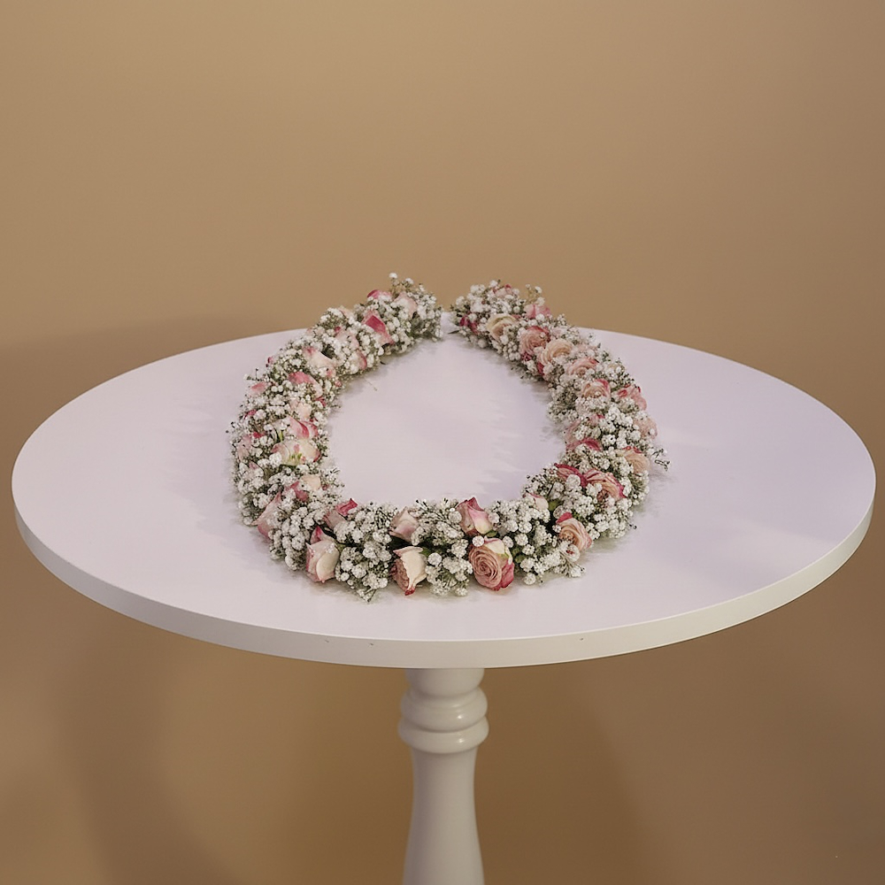 A long wreath of soft pink roses coordinated with dense white gypsophila flowers, combining simplicity and elegance, with a luxurious black satin ribbon that adds an attractive contrasting touch.