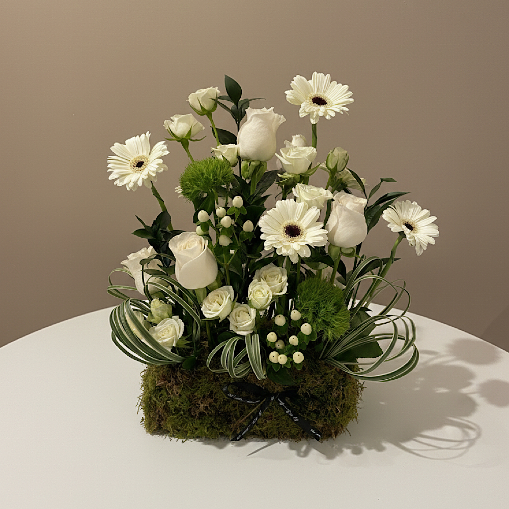 A bouquet that contains gerberas, roses and hypericums.