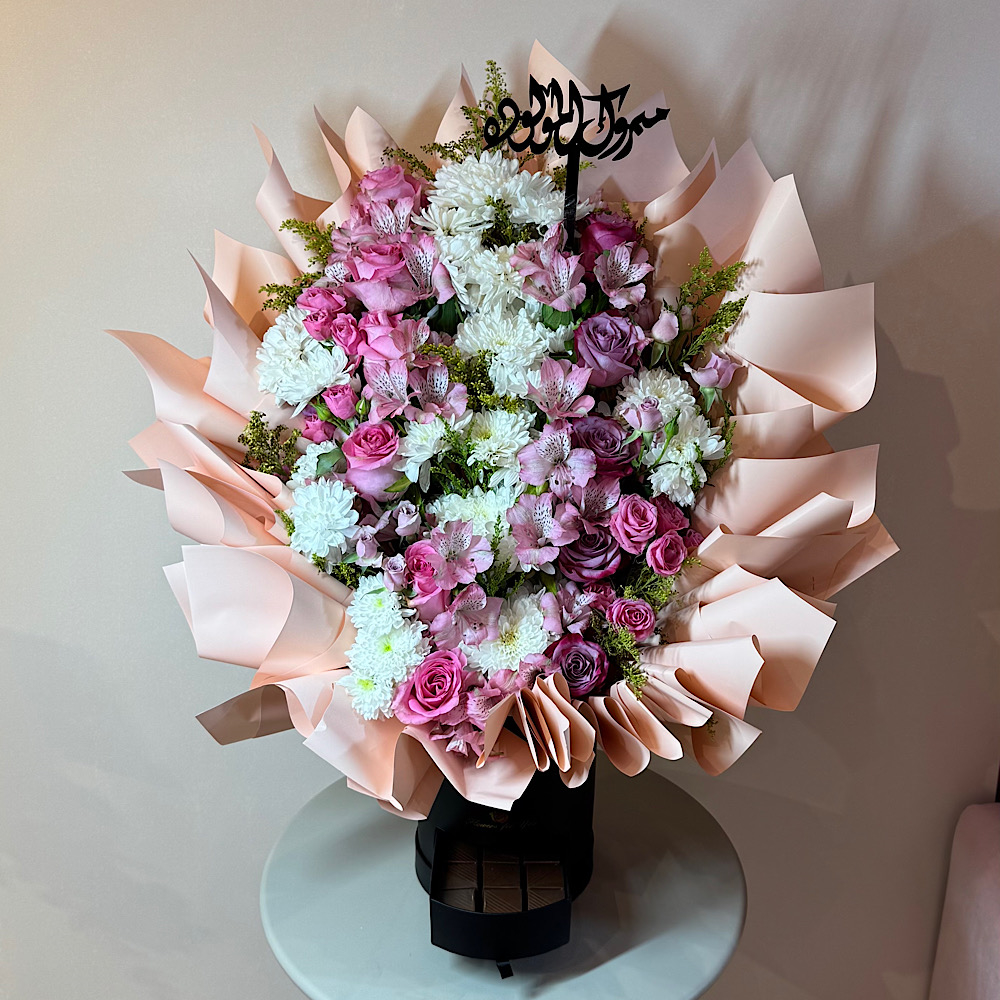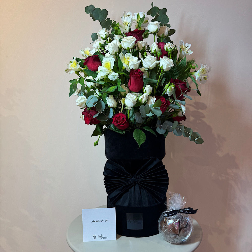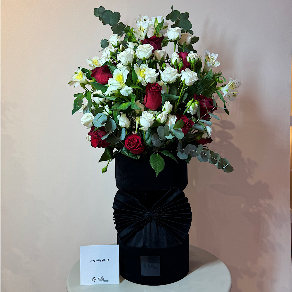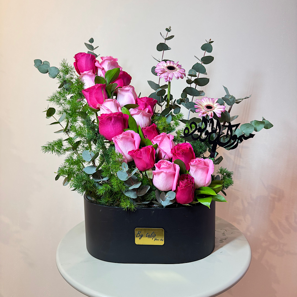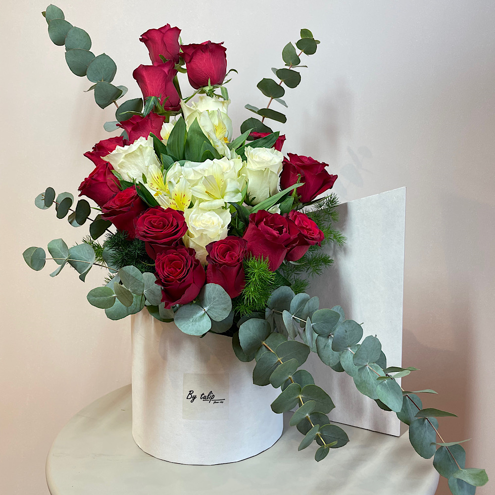 A box that contains roses, alstroemerias and eucalyptus.