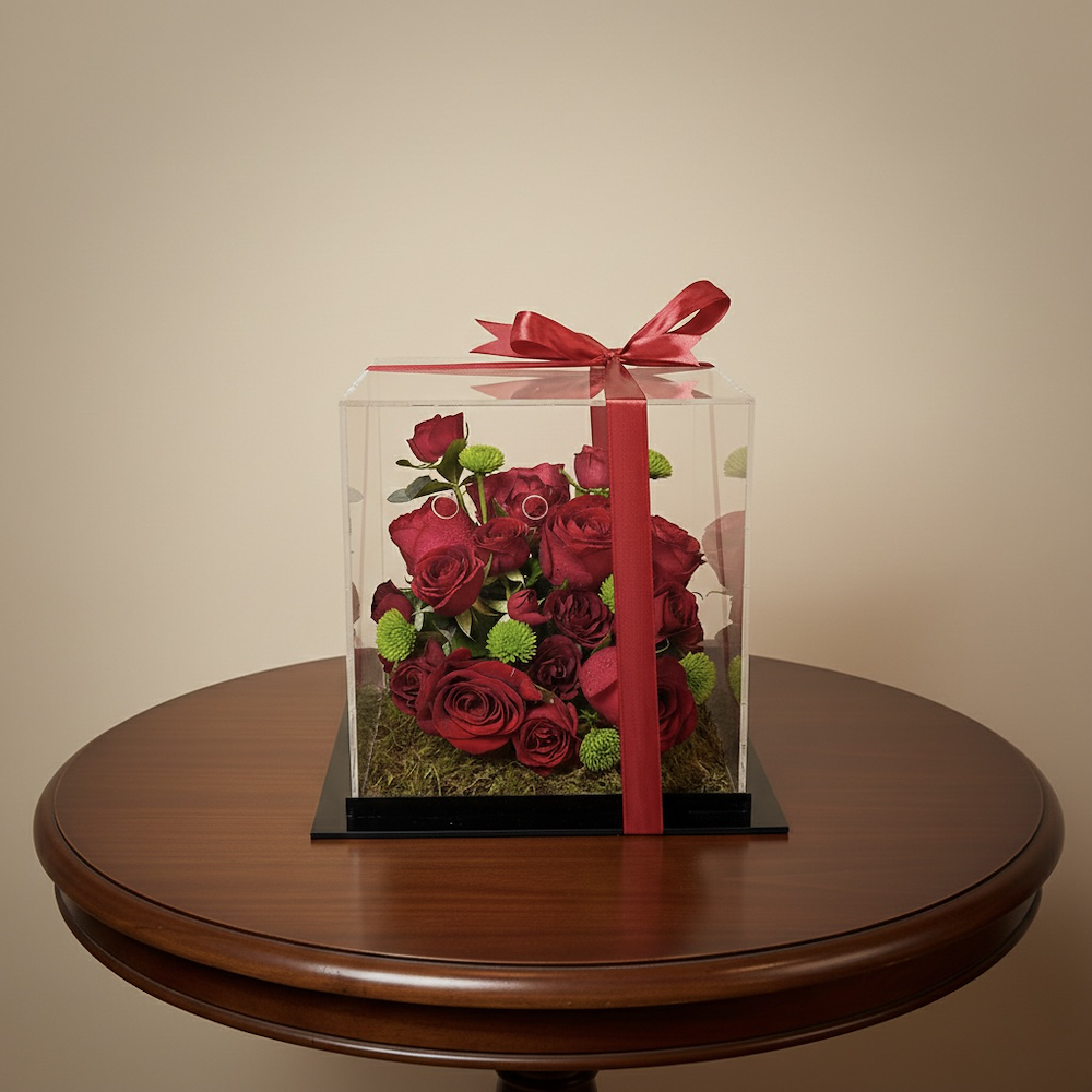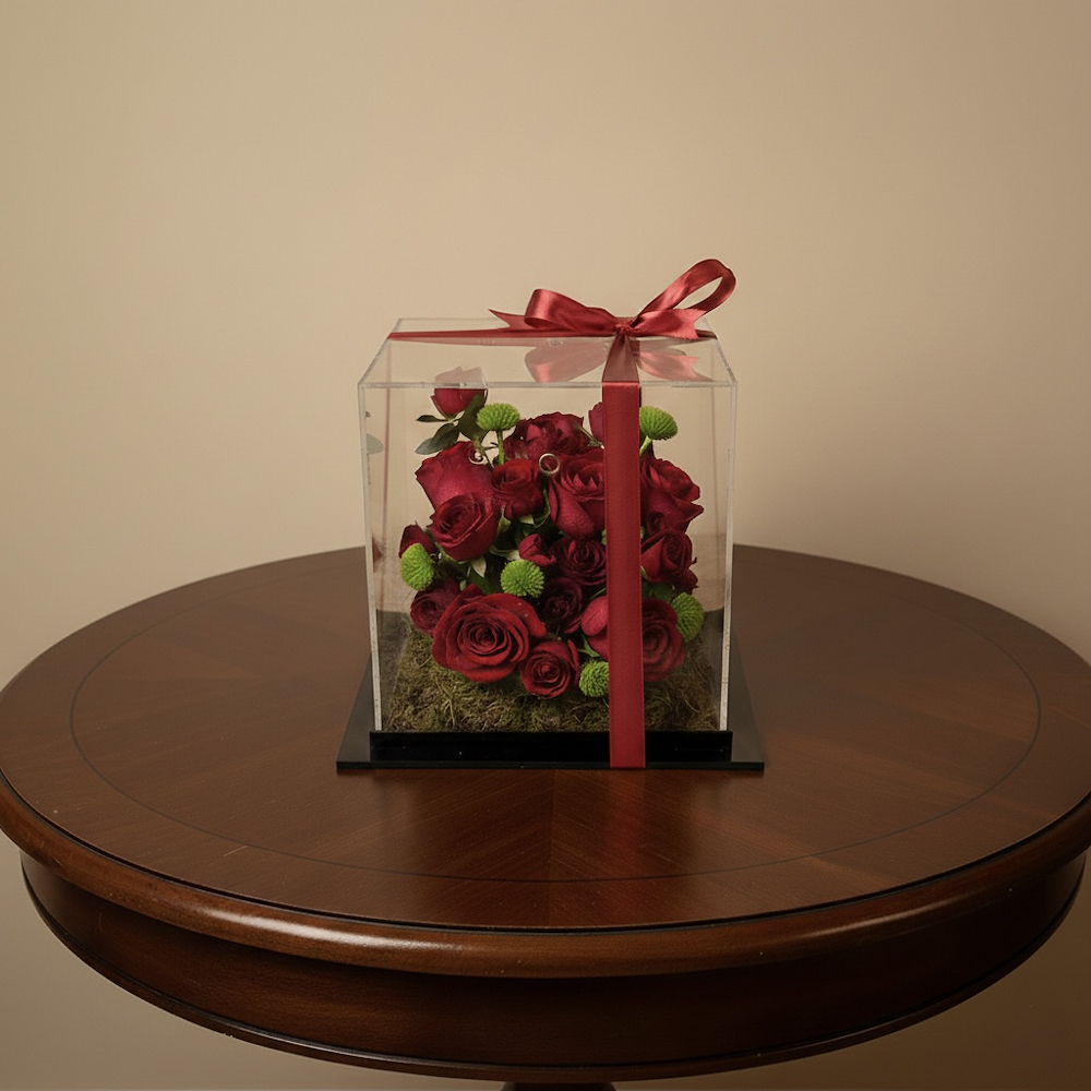 A unique arrangement inside a closed, clear acrylic cube, featuring an assortment of tiny red roses with fresh green chrysanthemum balls. The box is wrapped with a classic red satin ribbon, reminiscent of a gift.