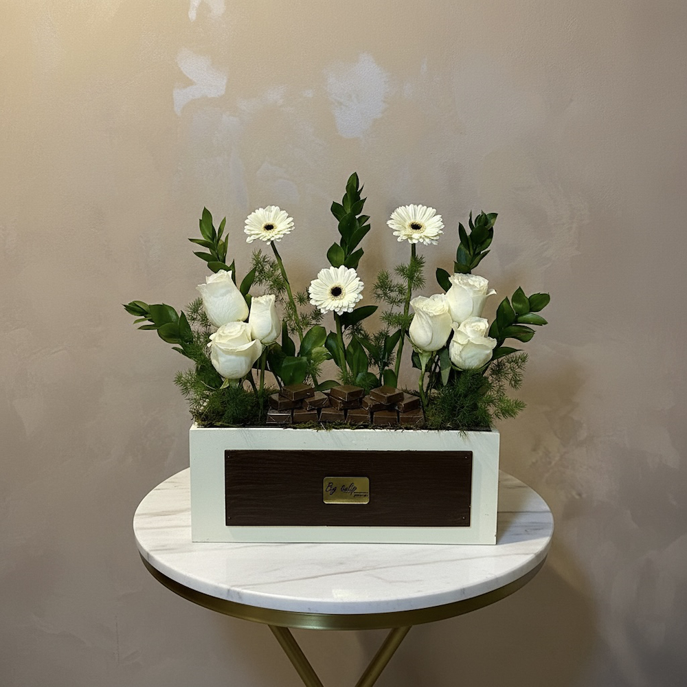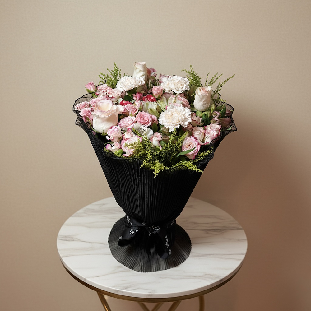 An elegant bouquet containing roses, baby roses, carnations and alstroemeria.