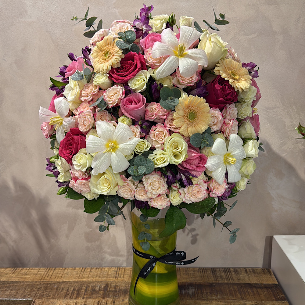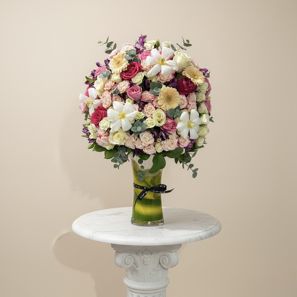 An elegant royal vase containing roses, baby roses, tulips, alstroemerias, and gerberas.