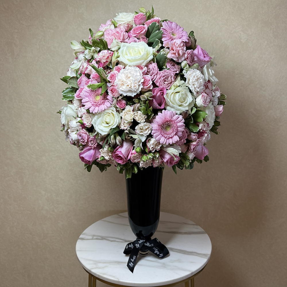 An elegant royal vase containing roses, baby roses, carnations, alstroemerias, and gerberas.