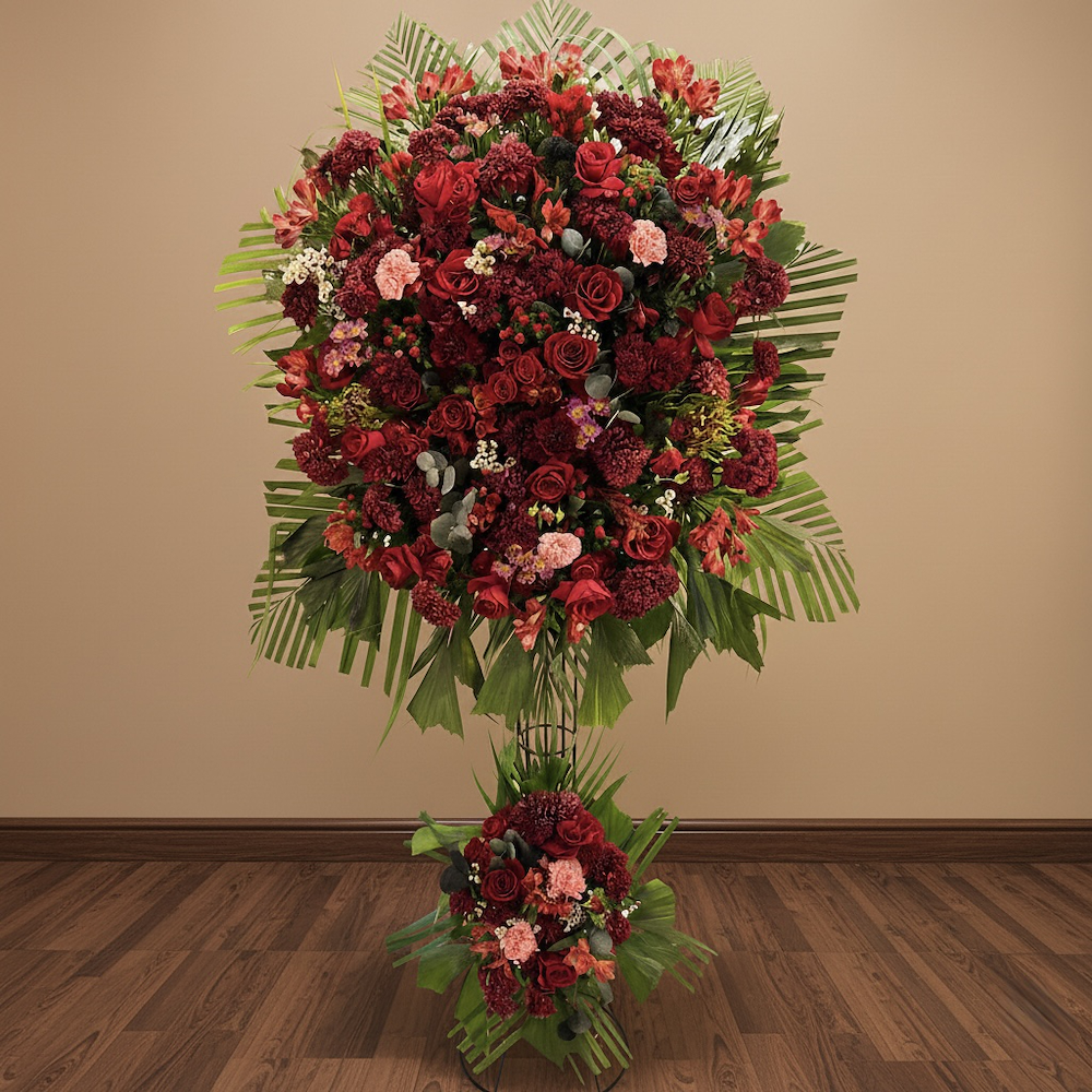 A rich and spacious arrangement within a semi-circular white box. It combines red roses and small white gypsophila with green eucalyptus leaves, creating a vibrant, lush appearance. It features a colorful "Love" planting in the center.
