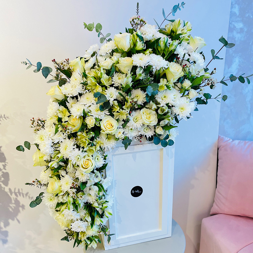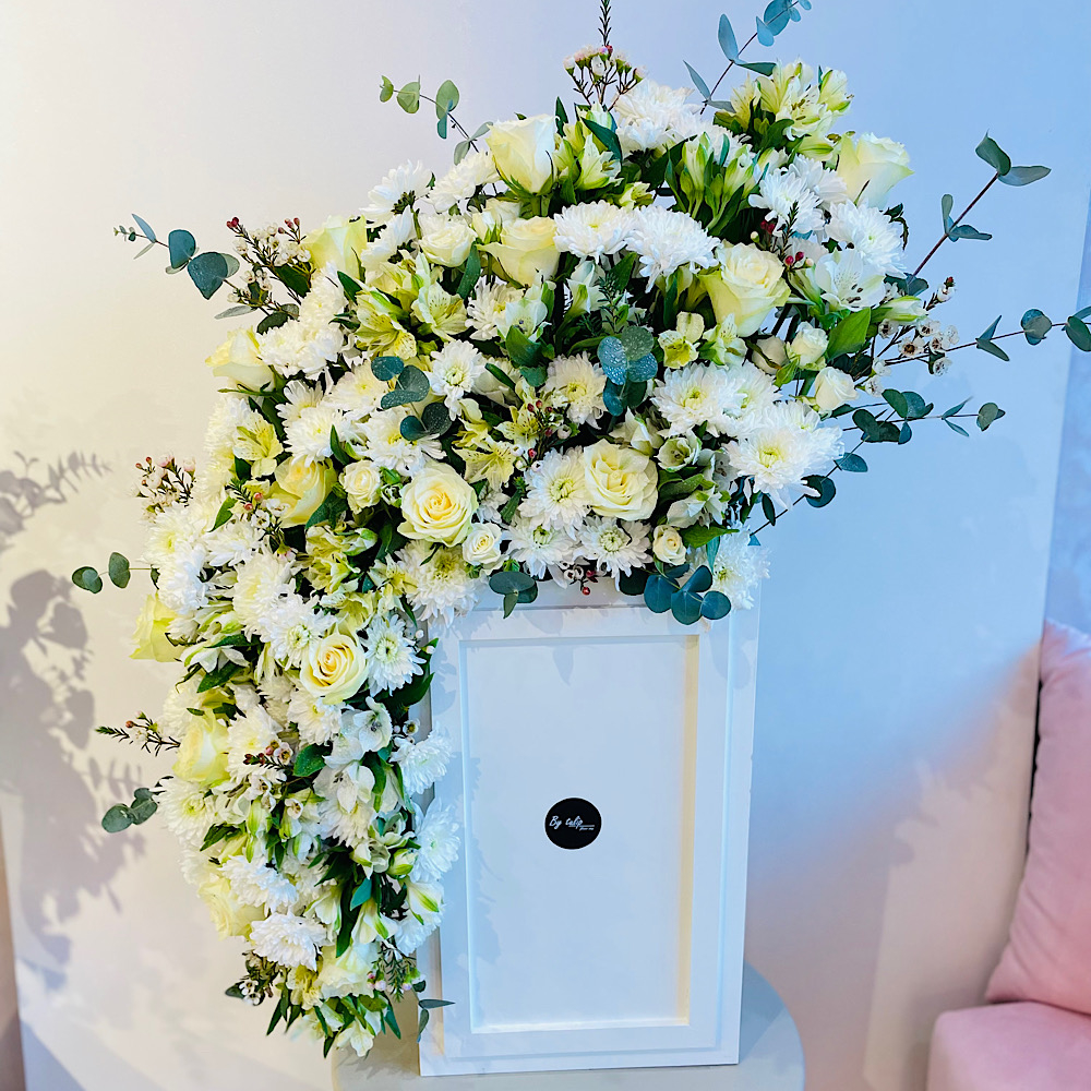 A luxurious floral arrangement on a white wooden base, featuring a cascading display of white flowers (roses, alstroemerias, and chrysanthemums) interspersed with flowing green eucalyptus branches, creating a waterfall-like effect. An ideal decorative piece for reception tables and entryways.