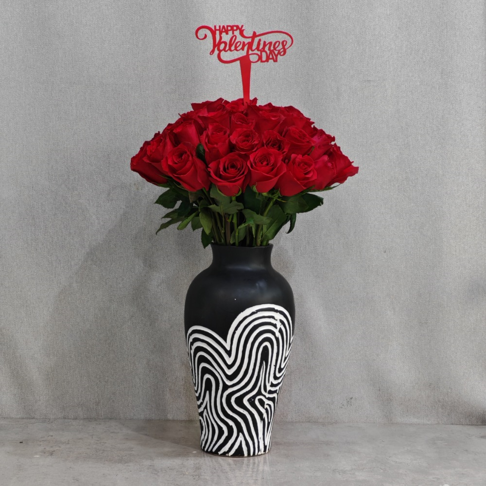 A classic gift combination of red roses paired with delicious chocolates, beautifully presented.
