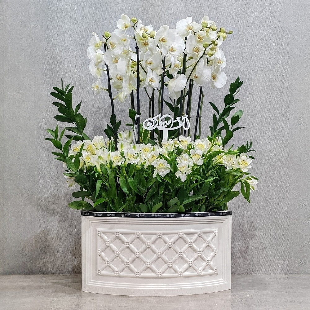 A bouquet of white orchid mix with ruscus and alstroemeria.