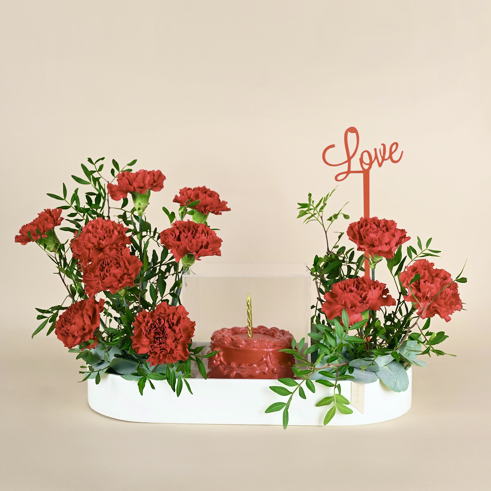 This box contains a bouquet of spray roses with a cake and 1 sparkle candle.