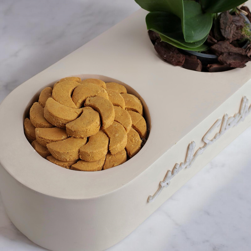 A bouquet containing white orchid plants, arranged beautifully in a stand. Comes with Ghuraiba.