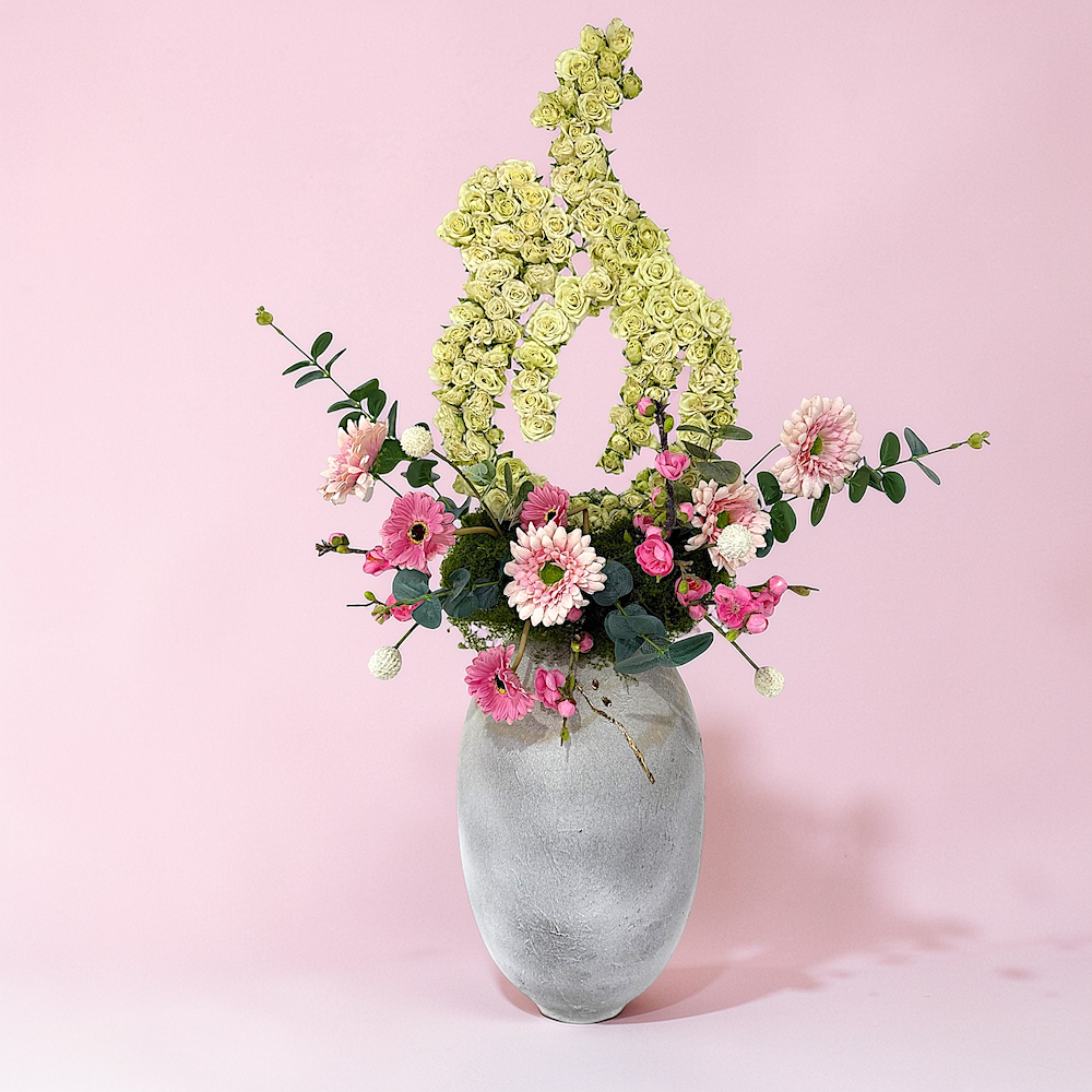 A bouquet containing artificial flowers, arranged beautifully in a vase.