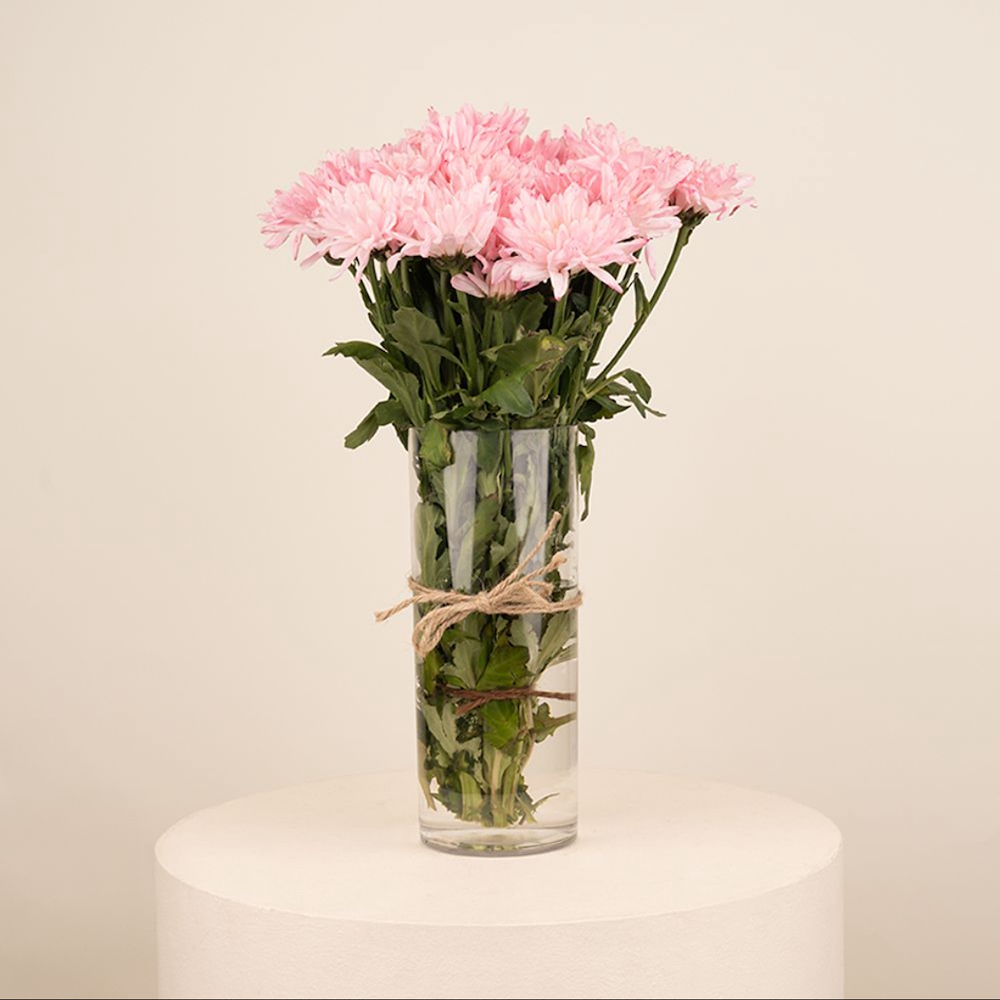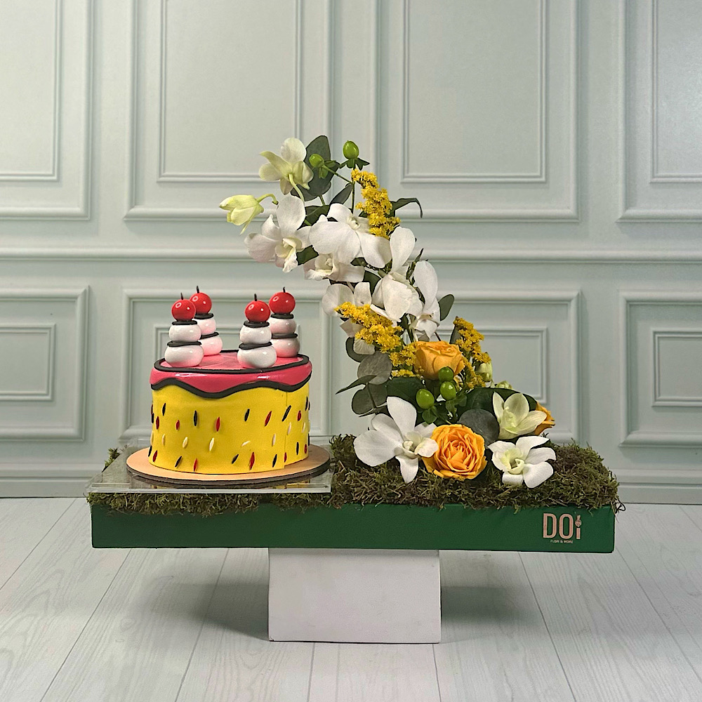 A hand bouquet that contains pink baby roses with happy birthday cake.