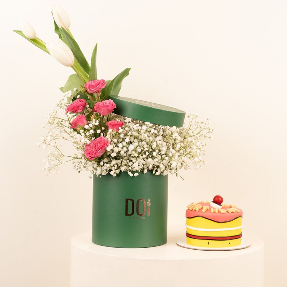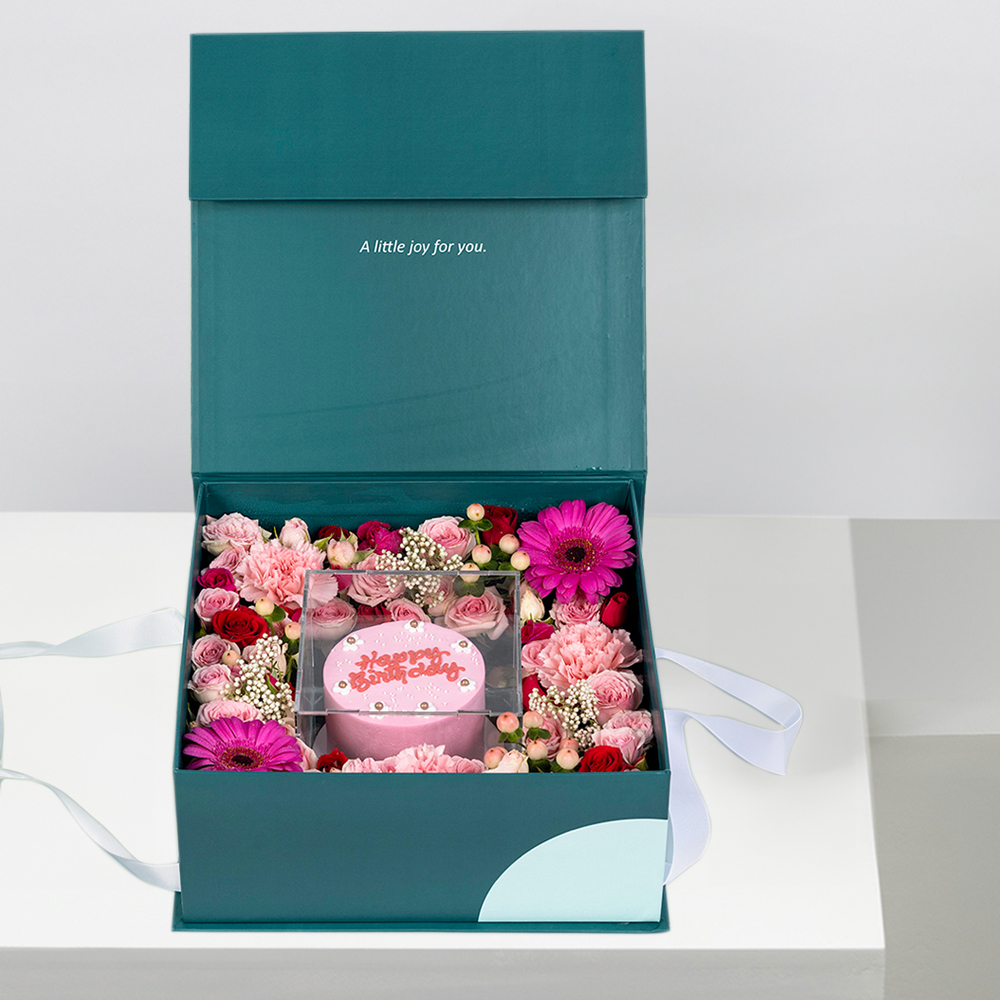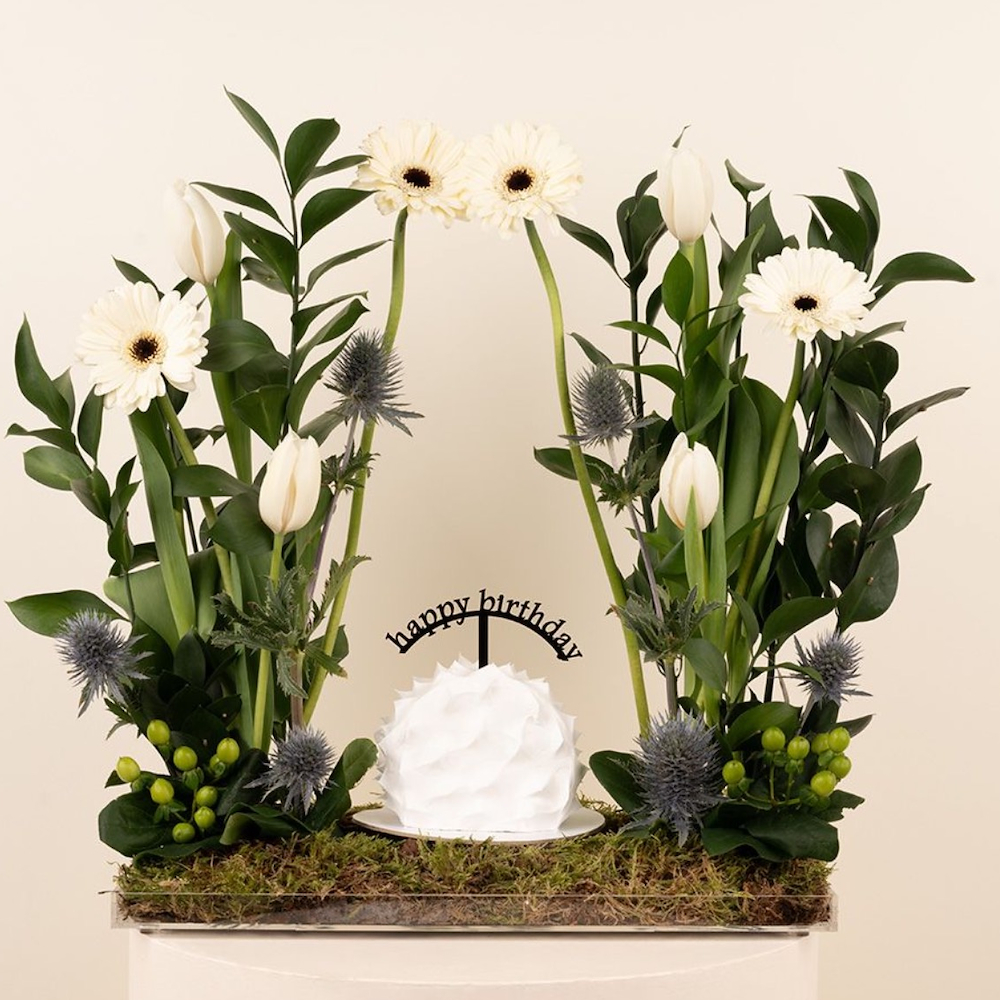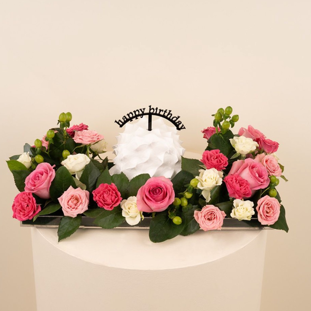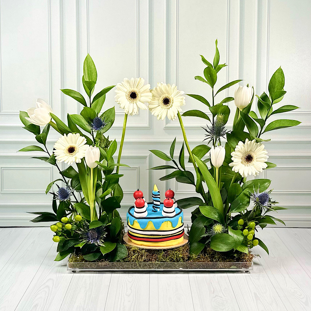 This acrylic tray contains gerbera and tulip flowers with a candles cake.