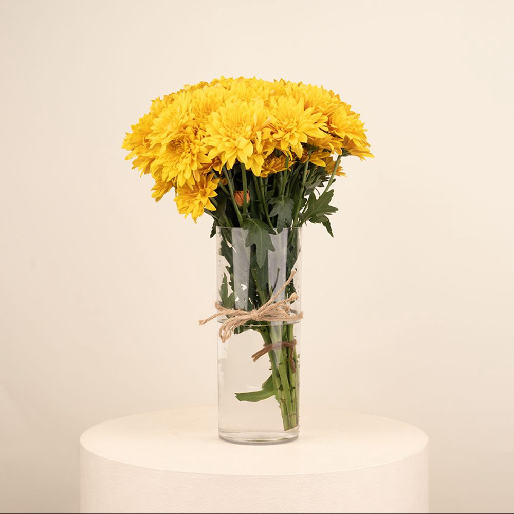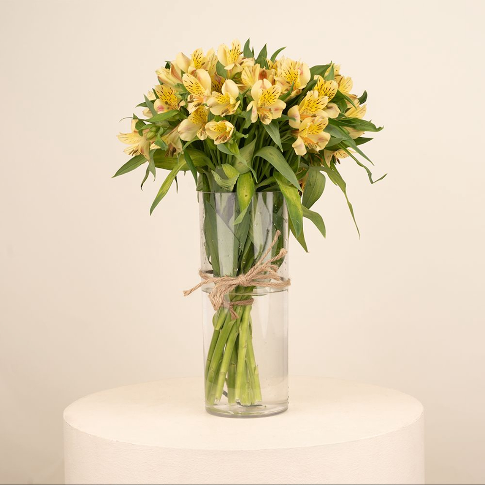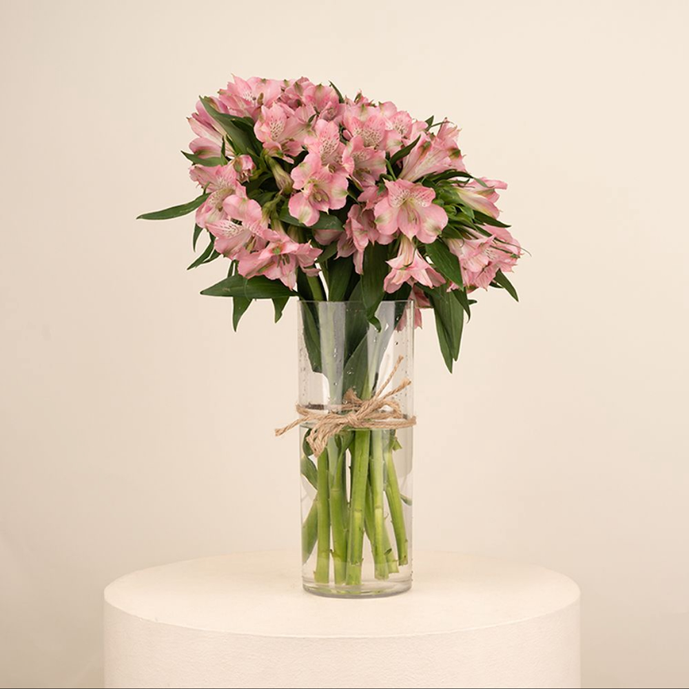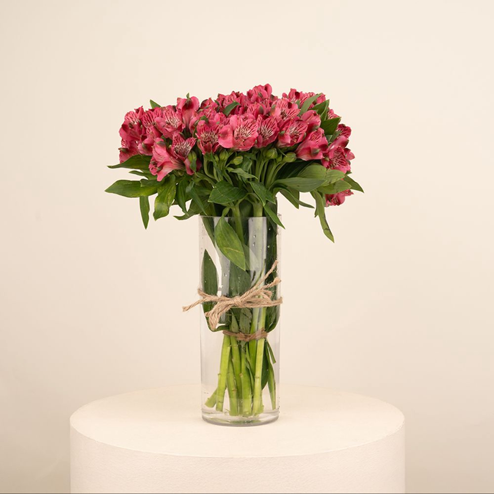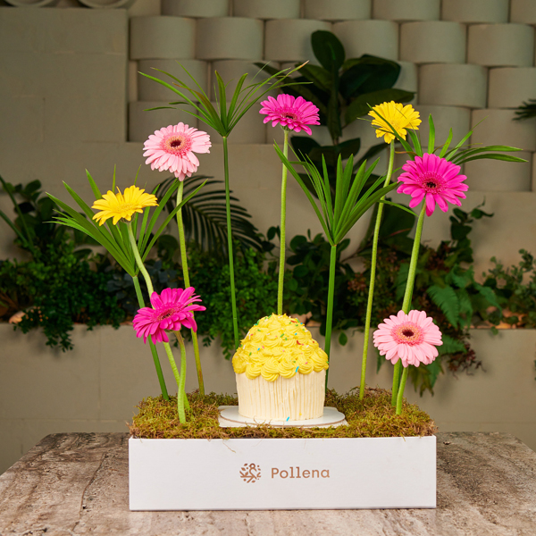 This acrylic tray contains gerbera and tulip flowers with a candles cake.
