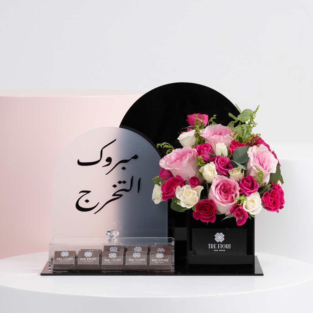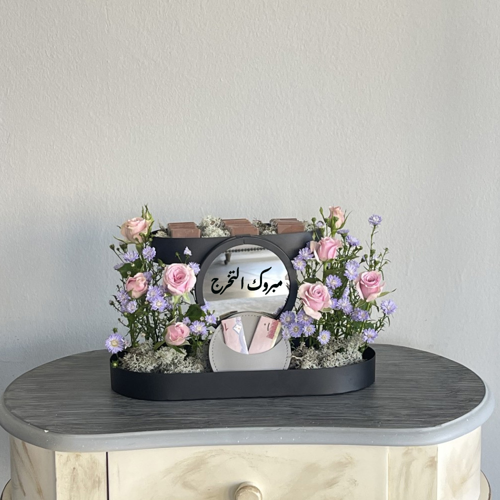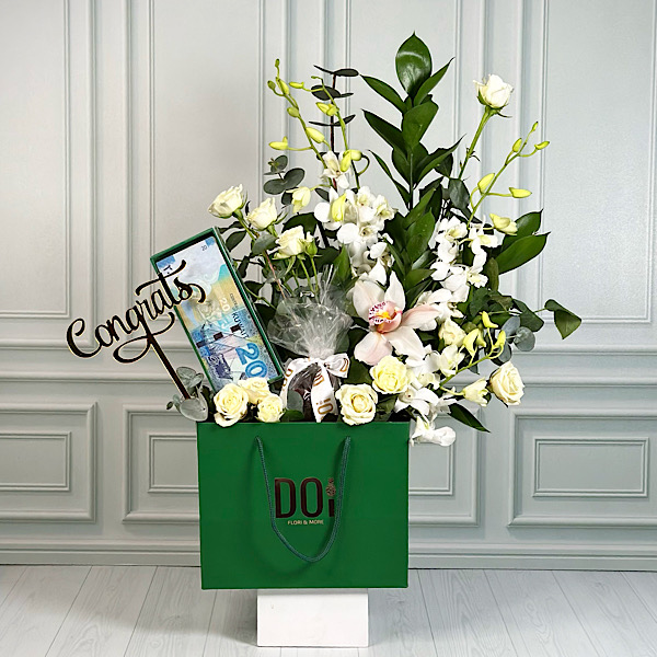 A green bag contains white baby orchid, white baby roses, white cymbidium and green leaves with and empty money acrylic box and chocolates.