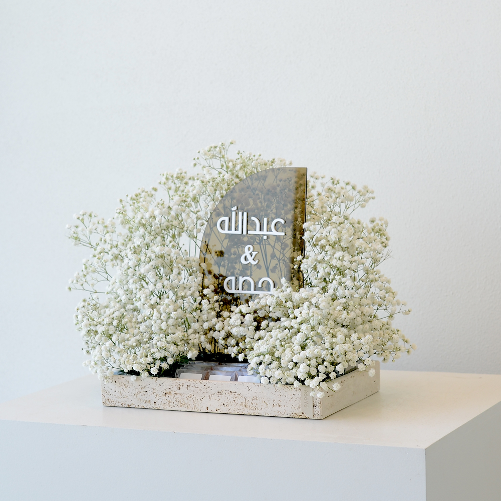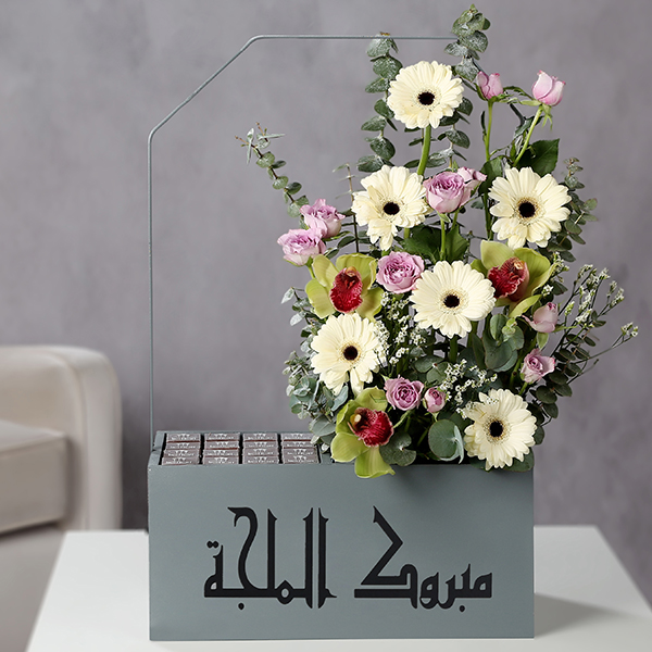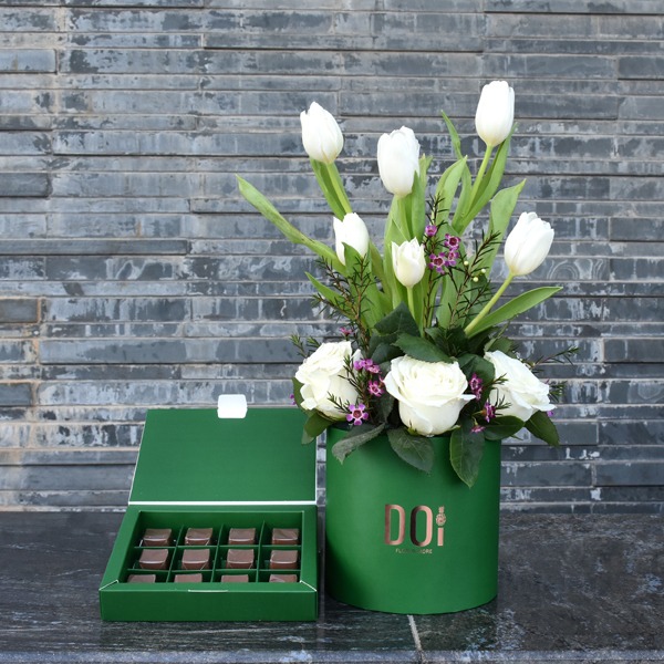 This green box contains roses and tulip flowers with green leaves. Comes with a box of chocolates.