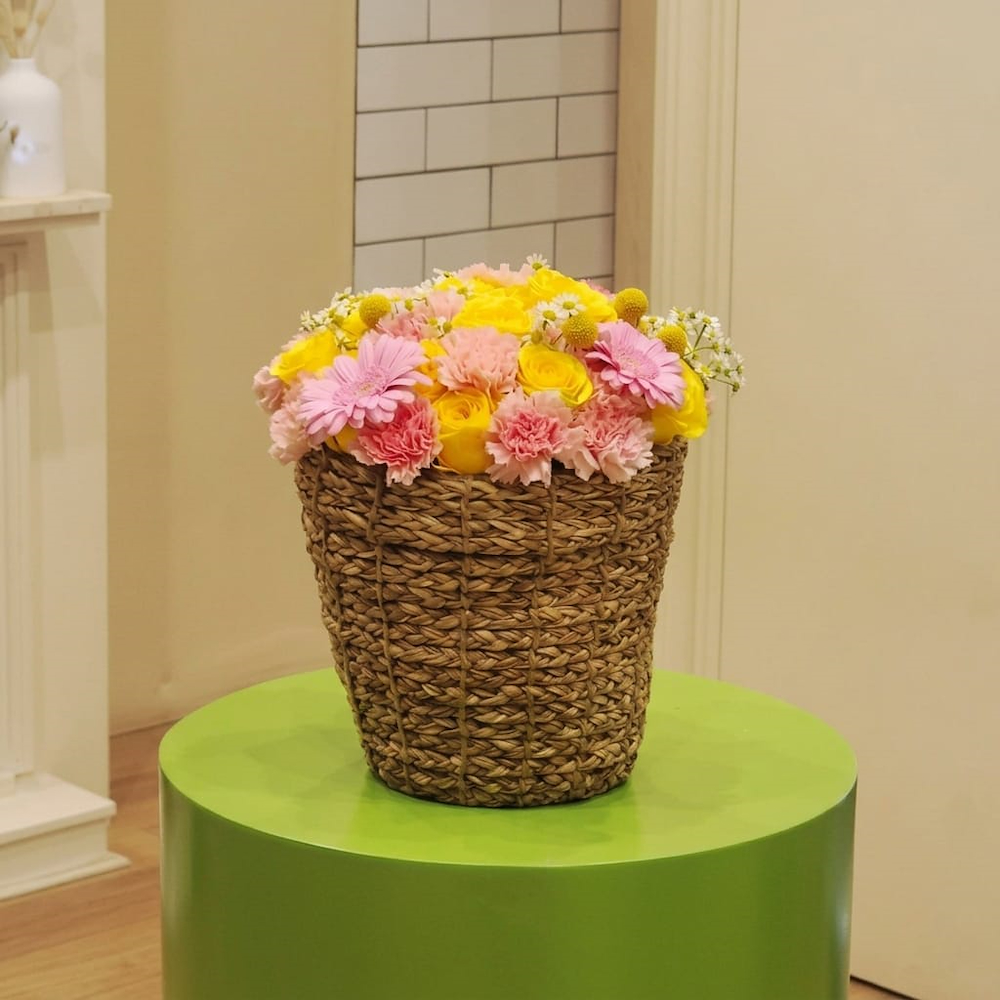 This basket features 20 yellow roses, 20 pink carnations, 4 pink gerberas, 4 craspedia, and 4 chamomile flowers, elegantly arranged in a basket.