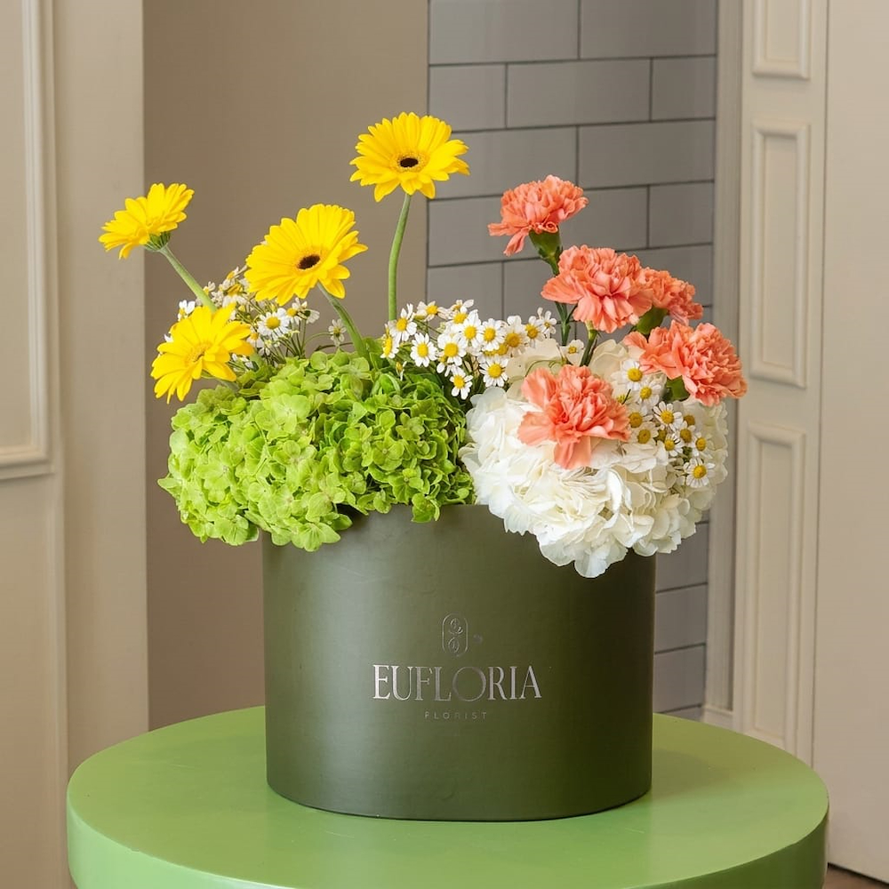 This bouquet features 5 green hydrangeas, 5 white hydrangeas, 5 orange carnations, 4 yellow gerberas, and 3 chamomile flowers, beautifully arranged in an olive box.