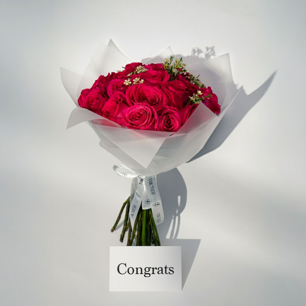 This hand bouquet contains fuchsia roses with a special bag.