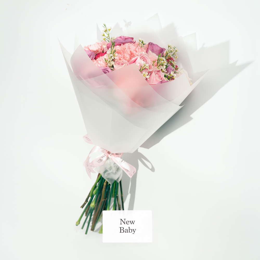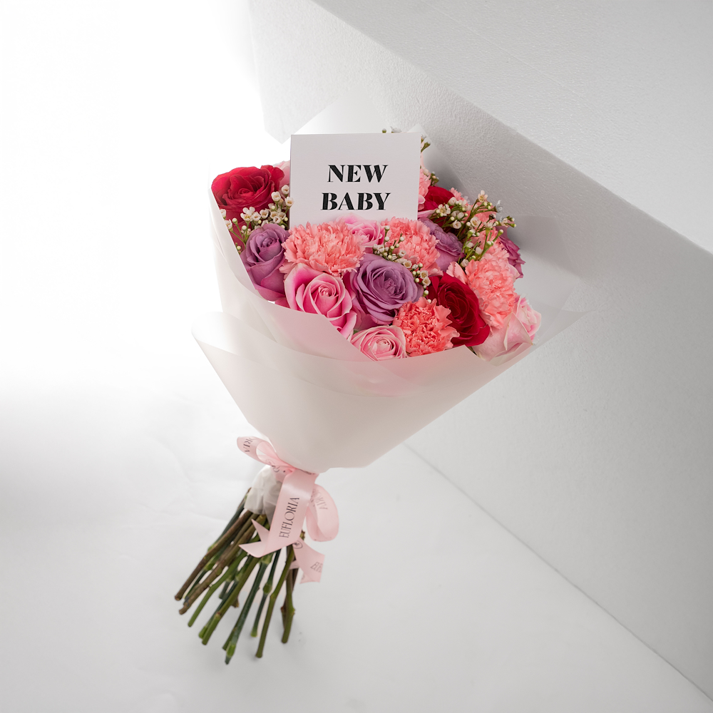 A bouquet contains pink, fuchsia and purple roses with a special bag.