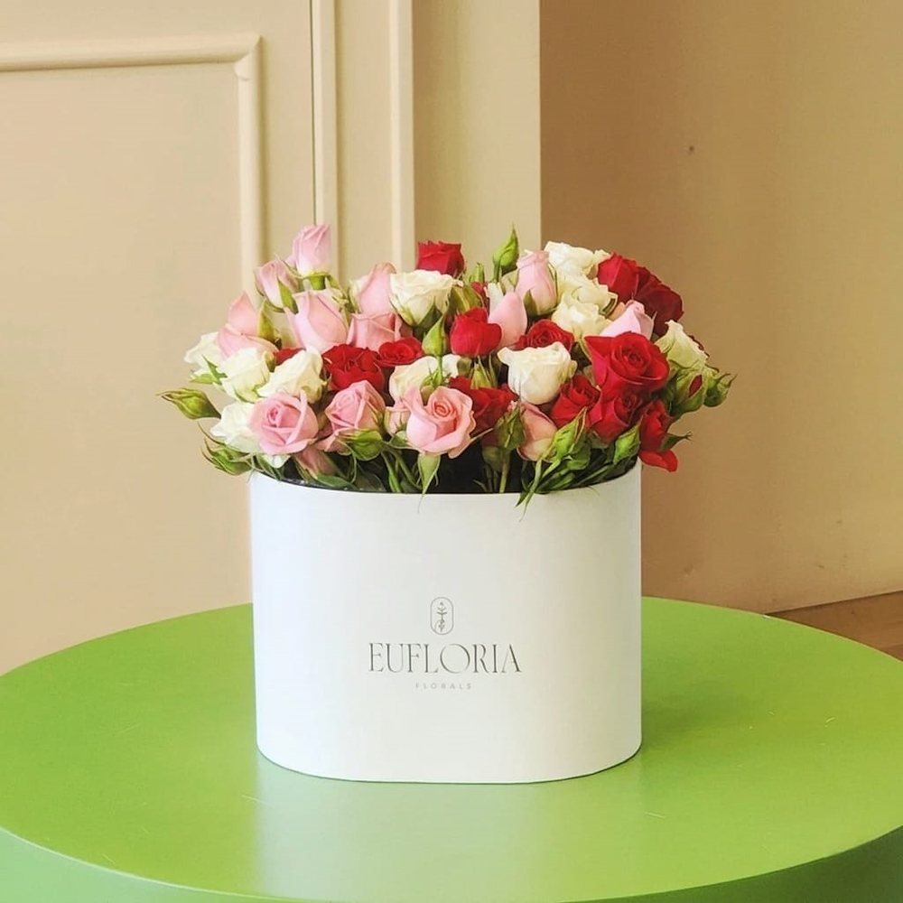 A flower box features 30 stems of baby roses in white, red, and pink with a special bag.